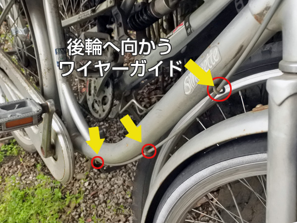 後ろに向かうブレーキワイヤーはダウンチューブ下のワイヤーガイドによって後ろへ導かれています。この自転車は1速のママチャリなので、変速ワイヤーがありませんのでガイドには1本のみ通されています。 変速ワイヤーの調整 ▲top