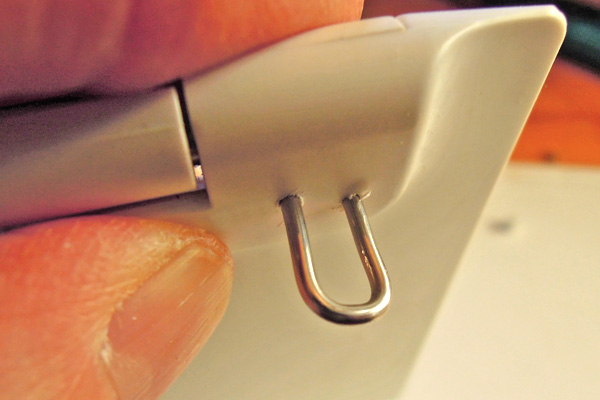 次に1.6mmのステンレス針金を余裕を持った10cmくらいにカットしておきます。(写真は短すぎです)次にカバーを被せたヒンジを準備しておきます。 ヒンジ部品をスタンドカバーにセットします。次にヒンジ金具中央穴にネジを締め込み本体にしっかり固定します。 スタンド修理 トップへ