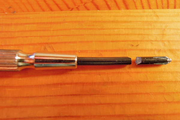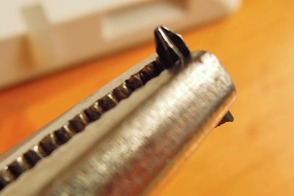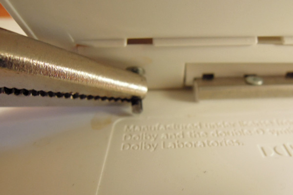 工具をつくる トップへ ここで使う工具は、精密ドライバー(+)とロッキングプライヤーの先細タイプ、マイクロドリル1.6mmとボルトカッターです。また材料としては、1.6mm径のステンレス針金を用意します。 スタンドを分解する トップへ 修理箇所はスタンド部分ですので、取り付けてある小さなネジを外します。短く折った精密ドライバーを先細のロッキングプライヤーに固く固定します。スタンドと止めてある左右のネジを緩めます。