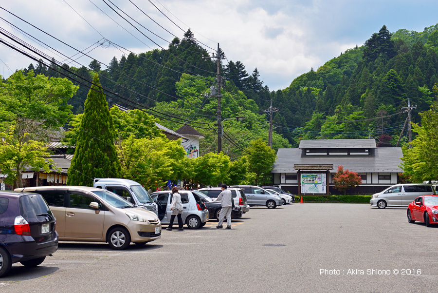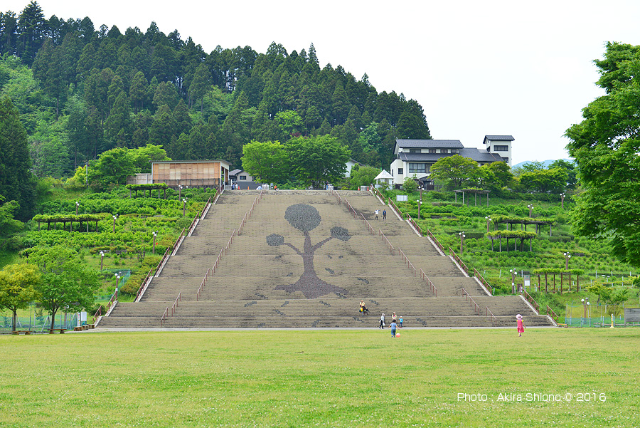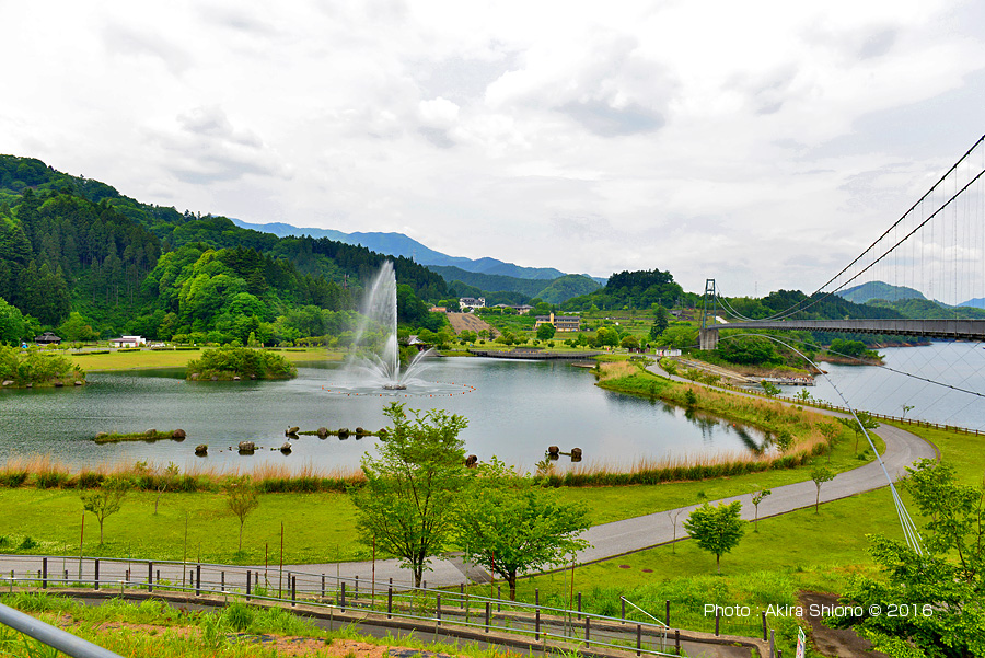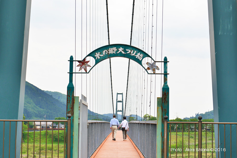 ![]() 水の郷大つり橋での下の道路から見た橋の景色。メイン階段とやまなみセンター