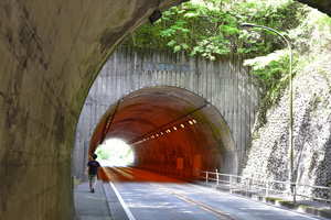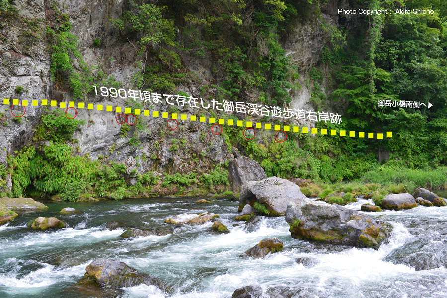駅からのもう一つの遊歩道への降り口は、東にある小さめのバスターミナルの後側にあります。こちらは斜度は駅前より緩いものの距離があります。ここを下って行くと眼下に「御岳小橋」が見えてきます。上の写真は、御岳のバスターミナルから下ってきたときの遊歩道とまわりの景色で、川の比較的近くに遊歩道が設置してあります。この橋が吊橋の「御岳小橋」で橋からはカーブして流れる急流の多摩川と四季折々の渓谷の景色を楽しむことができます。この橋で南北の御岳渓谷遊歩道に移動できます。50年位前に御岳小橋から南側(玉堂美術館側)にも岩盤に突き出したスリル溢れる遊歩道がありました。怖い思いをして渡ったことがありましたが、現在は岩盤にその痕跡を残すのみとなっています。 御岳駅周辺の南側の御岳渓谷遊歩道 トップへ 御岳駅周辺の多摩川には西の杣の小橋(多摩川第三発電所付近)から川に沿って南と北に2本の遊歩道が東の沢井の楓橋まで続いていました。現在は途切れている御岳小橋(2019.10に流失)の袂に南側に東に伸びる遊歩道が岸壁に設置され繋がっていました。この観光名所は昭和時代に出た大水で破壊されてしまったようです。この後を御岳小橋下流の岸壁にある歩道を支える構造材に見ることができます。遊歩道を向かうには一旦、吉野街道出なければなりません。道には東に払沢トンネルと御岳トンネルがあります。先の御岳トンネルを抜けると川へ下る坂道があります。この坂を下ると御岳遊歩道の南側に繋がります。