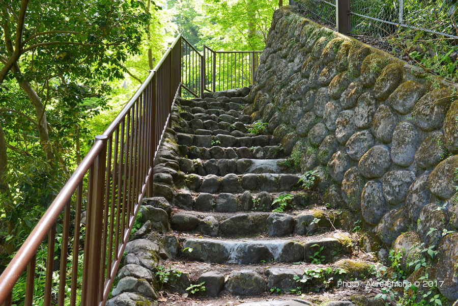 遊歩道は数カ所石段の箇所があります。右は寒山寺近くの長い登り石段