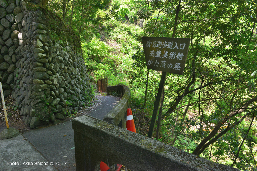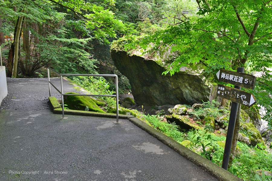 この辺りも遊歩道が川に非常に近くなっている場所で川は比較的平坦な流れになっていますが発電所に向って大岩が点在して景色に変化を与えています。 ![]() 御岳発電所近くの杣の小橋が遠くに見えます。 御岳駅周辺の御岳渓谷南遊歩道/御岳橋西 トップへ ![]() 玉堂美術館前のから奥へと御岳遊歩道が続きます。