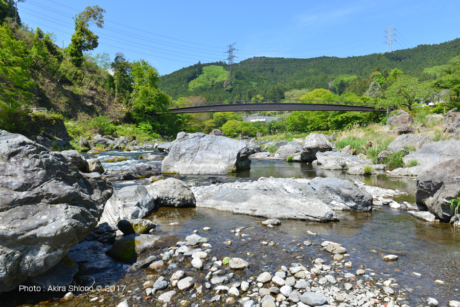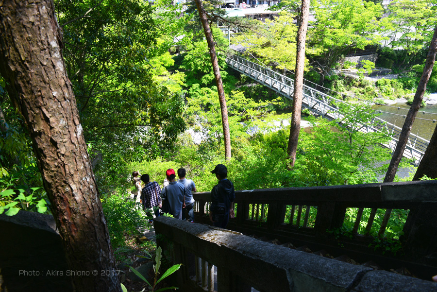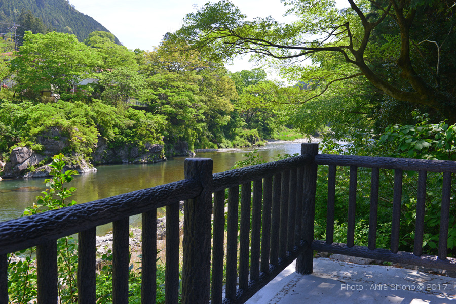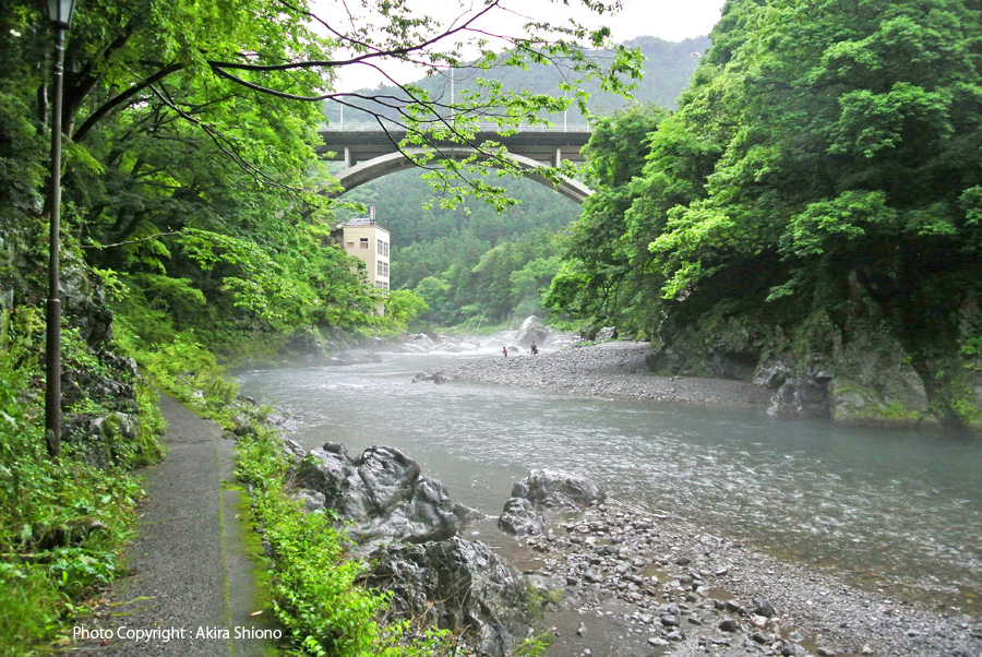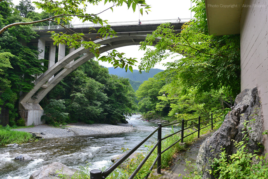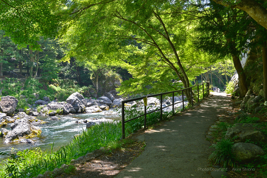 多摩川とJR青梅線は並んでいますが、殆どの駅が線路が山の中腹辺りで100m前後離れています。しかしこの御岳駅は一番近い御岳橋脇の降り口からは約50mと非常に近くなっています。渓谷で一番近い距離にあるということは急坂になっているということです。上の写真の御岳橋が、駅の正面の大通りになっていますので高低差を確認することが出来ます。 ![]() JR青梅線の御岳駅の正面に架かる御岳橋の下流左岸の遊歩道の新緑の頃の景色
