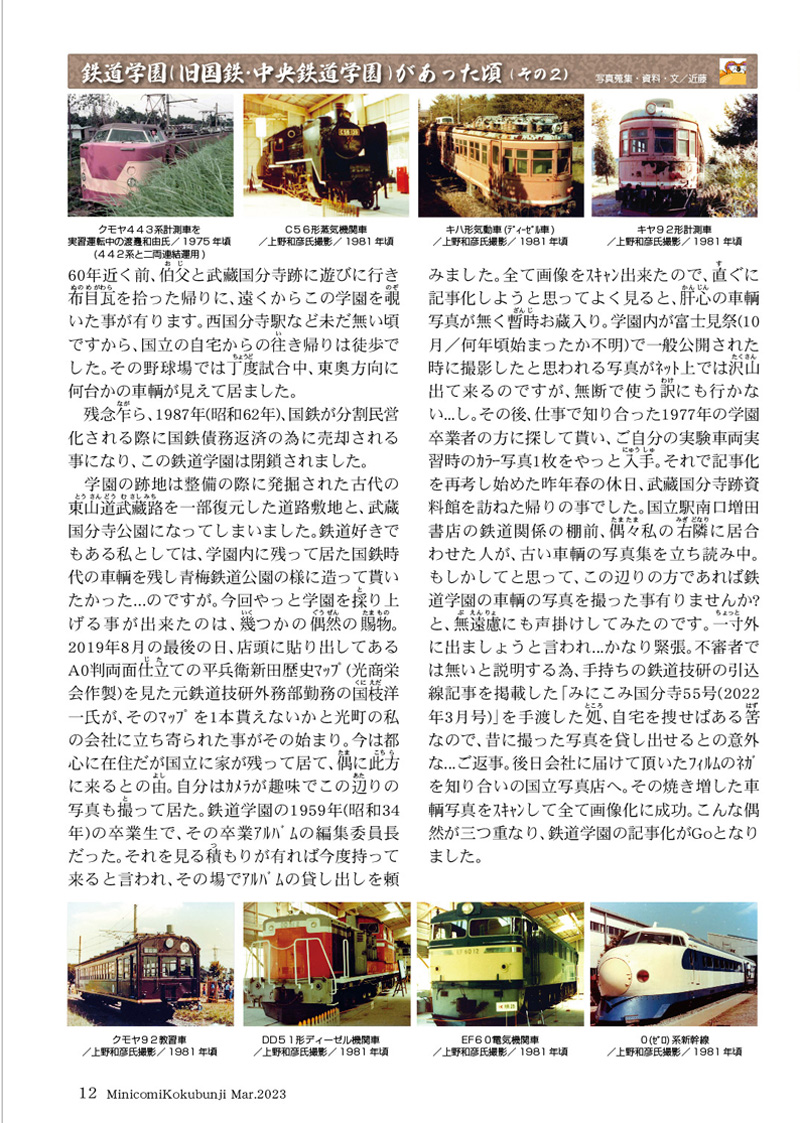 国鉄の中央鉄道学園と逓信住宅の跡地 トップへ ここ都立武蔵国分寺公園がある場所は、公園北側の「泉地区」は国鉄時代の中央鉄道学園があり、公園南側の「西元地区」は逓信住宅がありました。国鉄が債務を返済する為に、この中央鉄道学園敷地は売却されました。中央鉄道学園は鉄道に関わる教育施設で国分寺に当時敷かれていた下河原線(東京競馬場行きの路線)からここに引き込み線が敷かれていて外部と繋がっていました。当時敷地内には、教育の為に新幹線0系,101系電車,EF60形機関車などの古い鉄道車両が存在していました。リンク資料:みにこみ国分寺 57号、23号 当時の中央鉄道学園の敷地内 トップへ