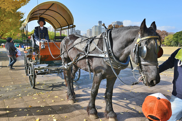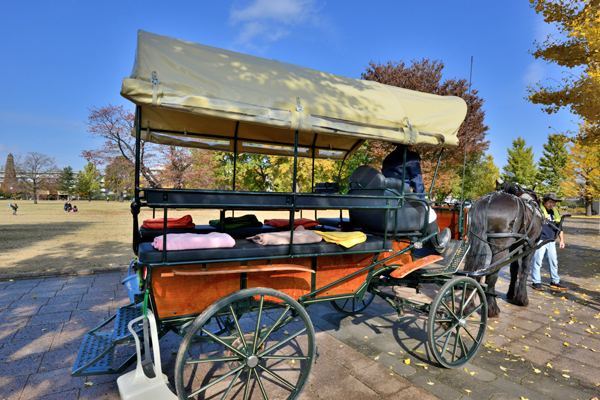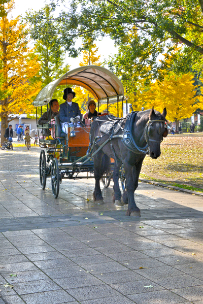 ![]() 秋も深まり通路に落葉したイチョウが奇麗です。突然、イベントの馬車に出くわしたのでビックリ!