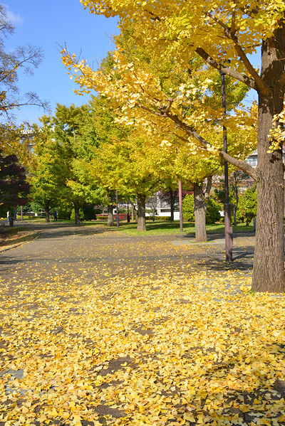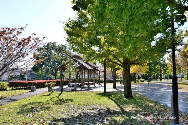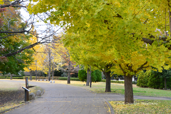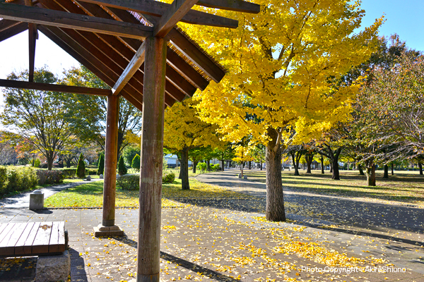 ![]() 泉地区の東側の銀杏並木は晩秋に彩りを増す。晩秋の“サクラ休憩所”と“メタセコイア休憩所”は銀杏が楽しめます。