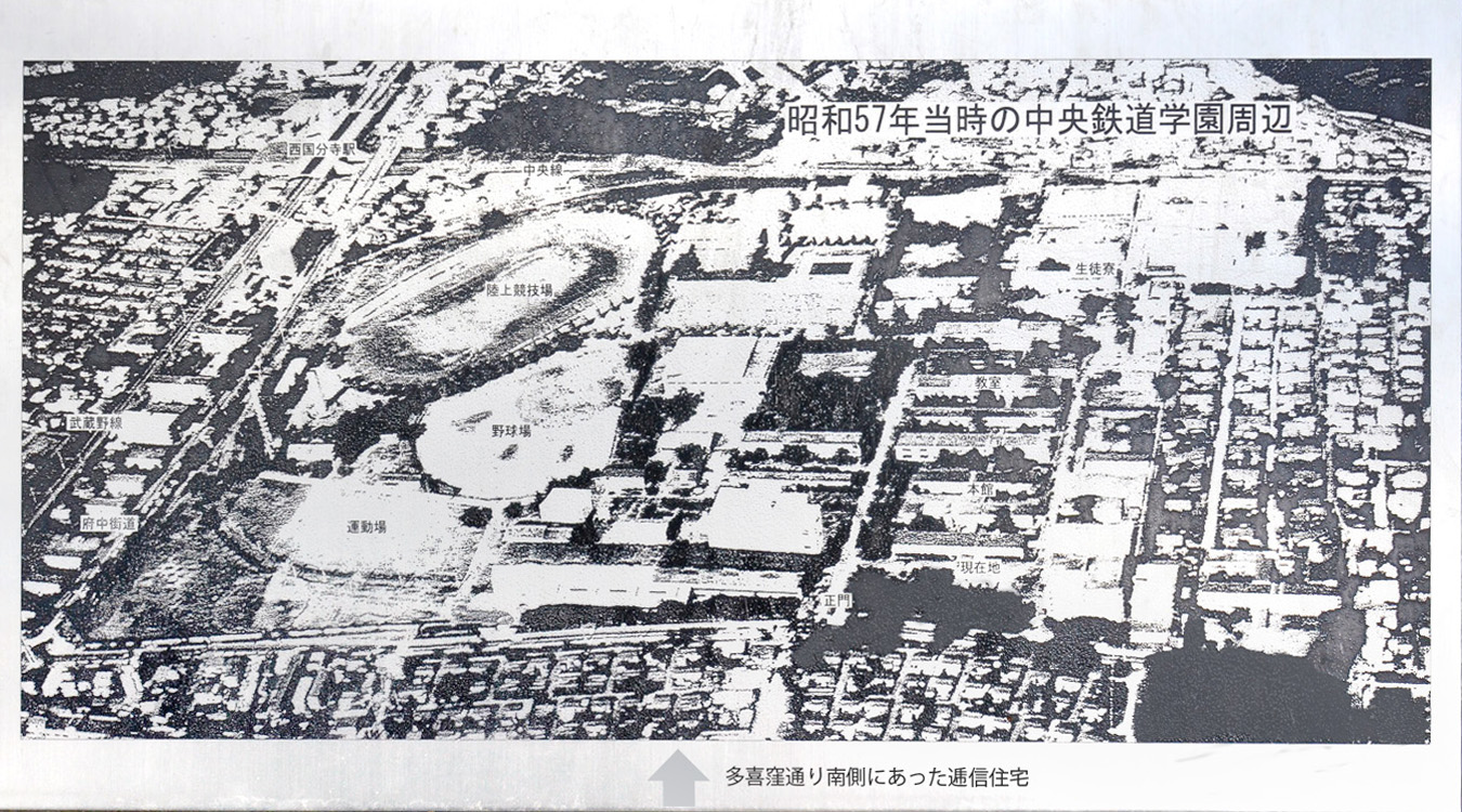 国鉄時代の中央鉄道学園は、現在の府中街道の西国分寺陸橋から泉町交差点の東側〜リオン前の丁字路までの面積を占めていました。下の蒸気機関車の動輪の記念碑の下には、当時の鉄道学園と逓信住宅のエリアが写っています。写真の左上が現在の西国分寺駅です。この敷地内には、陸上競技場、野球場、運動場がありました。この鉄道学園の正門は、多喜窪通りの南北に跨る「ふれあい橋」あたりから北に伸びています。 記念碑の由来 トップへ