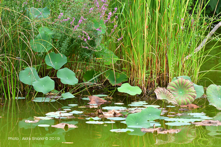 ![]() 武蔵の池全体が濁った緑色になっています。ノウゼンカズラの回廊では、濃いオレンジの花が咲いています。 ![]() 緑色に染まっ「た武蔵の池」の浮島には、この時期毎年のようにハスの花、ミソハギの花が咲きます。 西元地区:武蔵国分寺公園 トップへ