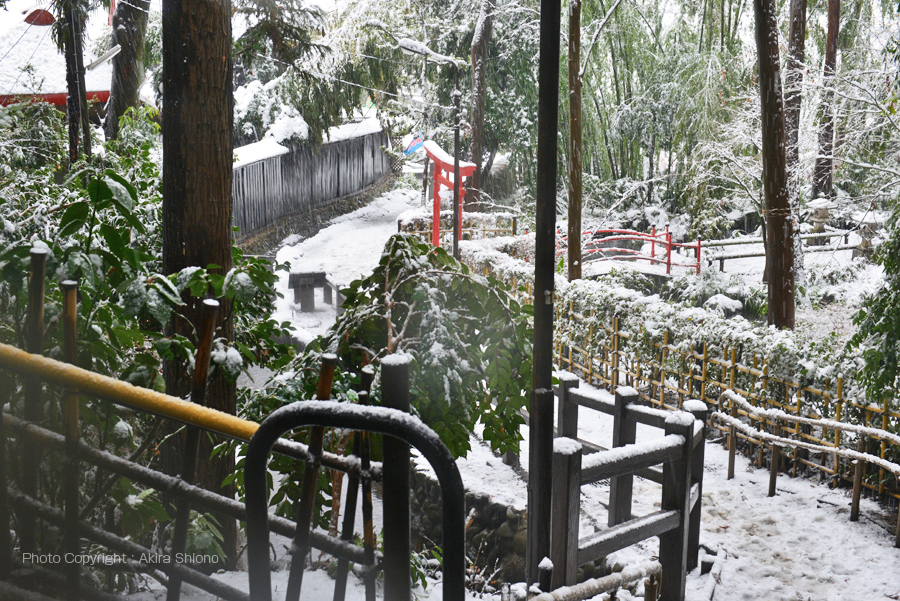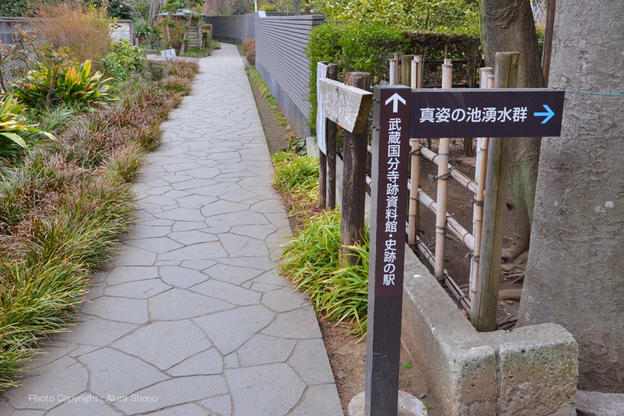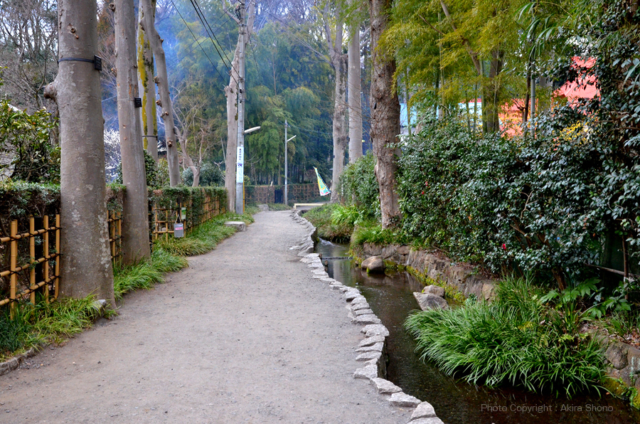 ![]() 東西(左右)に伸びる「お鷹の道」から真姿の池湧水へむかう道 その道の水路で奥左に「真姿の池」があります。
