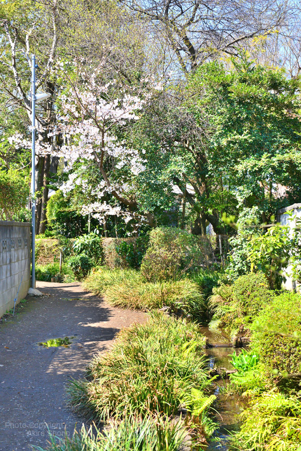 上のイラストの赤い線の右端(東側)の住宅街の中に「お鷹の道遊歩道」の入口があります。また、左端(西側)にも入口がありますが、こちらは武蔵国分寺の寺域の塀に沿って東に進むとお鷹の道に入ることが出来ます。 このエリアは小川の近くに降りられる様に数カ所に石段があります。左側の写真は入口から入った所にある景色でこの時は対岸に植えてある春で桜が花を付けていました。この小川の上流は、真姿の池湧水と国分寺崖線湧き出た湧水が合流し下流に流れる一里塚の国分寺街道辺りで日立製作所中央研究所を水源とする「野川」と再び合流します。ちなみに左の写真はお鷹の道西端で、湧水園からの湧き水が流れ出しています。 湧水と水路/お鷹の遊歩道の見どころ トップへ