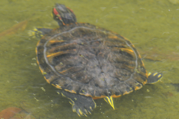 言葉を覚え始めくらいの幼児が、宝物を見つけたように「カメさん、カメさん」と叫んでいたので見てみると、甲羅が20cmくらいのカメがいました。このカメはおそらく飼いきれなくて放したカメのようです。よく見ると問題の日本古来の生態系を壊すといわれている雑食の外来種のアカミミガメでした。今まで日本にいるカメは“クサガメ”でしたが、最近はほとんど見なくなりました。こういう場所でも一寸した行いが、在来種を絶滅に近づけているような気がしました。
