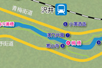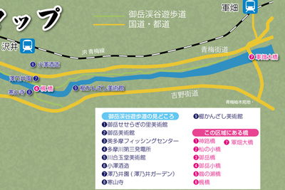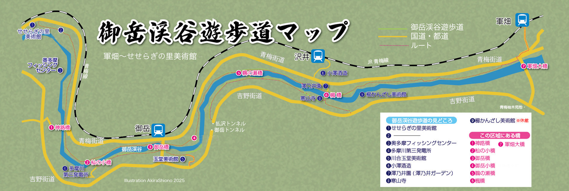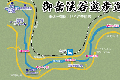 御岳渓谷遊歩道 MitakeValley Riverside Trail 四季の変遷: トップ 1月 2月 3月 4月 5月 6月 7月 8月 9月 10月 11月 12月 5月の御岳渓谷遊歩道の軍畑〜楓橋所 御岳発電所〜せせらぎの里美術館 新緑の鵜の瀬橋から御岳小橋 澤井から鵜の瀬橋 新緑と紅葉の澤井〜御岳発電所 1月の御岳発電所から御岳小橋 青梅 軍畑/楓橋下流の2月と野鳥 12月の澤井/楓橋周辺と野鳥 御岳渓谷遊歩道南路開通 紅葉の鵜の瀬橋周辺 紅葉の楓橋周辺 ※上のマップの拡大(1900x640pix)はこちら■軍畑〜澤乃井園 トップへ 清流・渓谷の景色など自然を身近に感じられる御岳渓谷。この遊歩道が始まる東端の入口が、軍畑大橋の西側にあります。入口は目立ちませんが、青梅街道の南側の歩道にあります。ここの急な石段を下りると、木立の奥に多摩川の清流が現れます。ここから“せせらぎの里美術館”までの御岳渓谷遊歩道が始まります。 こちらから移動します ■澤乃井園〜鵜の瀬橋 トップへ 御岳渓谷遊歩道の中央部に位置する区域です。多摩川右岸は壁が崩落して通行止めになている為に、澤乃井園傍の川沿いの遊歩道を通ります。ここから目的地の鵜の瀬橋までは、片側が崖になっている遊歩道です。人がすれ違う時には注意が必要です。この辺りは高い位置から岩の多い変化ある清流を眺めることができます。 このエリアの記事は、こちらから移動します ■鵜の瀬橋〜御岳小橋 トップへ 御岳渓谷遊歩道の中央部から西側に位置する区域です。多摩川は軍畑〜ほぼ東西に水平近いかたちで流れていましたが、この鵜の瀬橋以西は大きく南にカーブしています。湾曲していることは、岸に大岩や岩盤がある証拠で、比較的景色に変化が出て美しくなります。特にJR青梅線の御岳駅より東にある御岳小橋下流から、駅前の御岳橋辺りは御岳渓谷の最も渓谷らしい景色が続いています。 このエリアの記事は、こちらから移動します ■御岳小橋〜御岳発電所 トップへ 御岳渓谷遊歩道の中央部から西側に位置する区域です。多摩川は軍畑〜ほぼ東西に水平近いかたちで流れていましたが、この鵜の瀬橋以西は大きく南にカーブしています。湾曲していることは、岸に大岩や岩盤がある証拠で、景色に変化が出て美しくなります。特にJR青梅線の御岳駅より東にある御岳小橋下流から、駅前の御岳橋辺りは御岳渓谷の最も渓谷らしい景色が続いています。 このエリアの記事は、こちらから移動します ■御岳発電所〜せせらぎの里美術館 トップへ 御岳渓谷遊歩道の西端に位置する区域です。多摩川は御岳小橋から御岳発電所までは東西に水平近いかたちで流れていましたが、この御岳第三発電所の排水口からは北に立ち上がり流れていきます。この区間には、奥多摩フィッシングセンター、たましん御岳美術館、奥多摩町立せせらぎの里美術館などがあります。渓流釣りをする方はこの区間はOFCの有料区間となりますので注意が必要です。 このエリアの記事は、こちらから移動します 付録:冬期の澤井/楓橋周辺と野鳥 トップへ