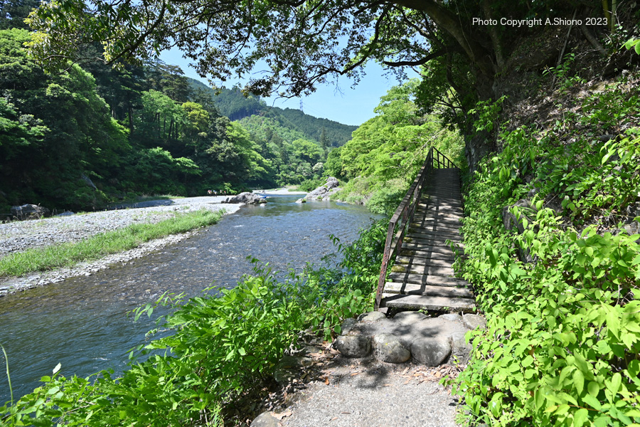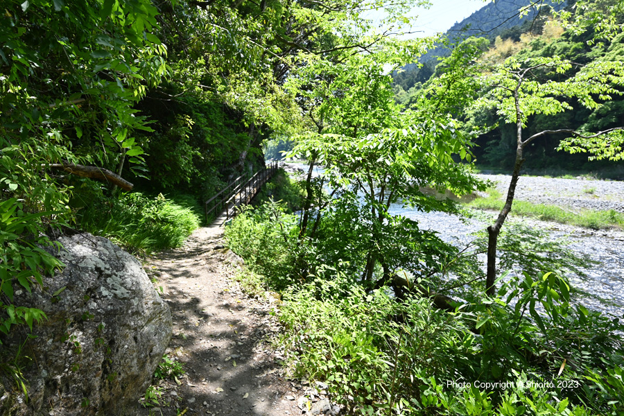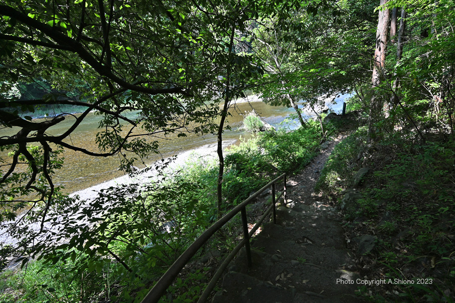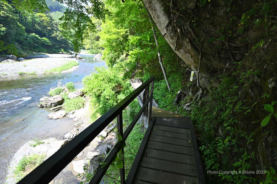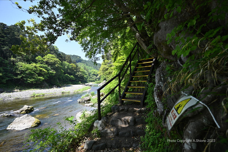 新緑の御岳渓谷遊歩道東入口〜沢井・楓橋 移 動: 御岳渓谷遊歩道 東端入口から入渓 新緑の御岳遊歩道 景色が開ける大木がある中間地点 川上に架かるはしご階段のエリア 楓橋に向かうエリア リンク: 杣の小橋上流から 御岳橋方向へ 玉堂美術館へ 御岳小橋周辺 左岸から発電所方向へ 杣の小橋へ 1月の御岳渓谷遊歩道 御岳渓谷遊歩道~御岳山入口の路 御岳山周辺の見どころ 御岳小橋下流右岸の岩壁の遊歩道跡 御岳渓谷遊歩道右岸通行解除 新緑の御岳渓谷遊歩道杣の小橋~御岳小橋 青梅市御岳渓谷周辺コース 多摩川上流部4つの水力発電所 2019年の台風15・19号で御岳小橋は流失しました。 御岳渓谷遊歩道 東端入口から入渓 ▲top ![]() 青梅街道の軍畑大橋西側にある「御岳渓谷遊歩道入口」より下り坂 撮影:NIKON Z6II+Z14-30mmf/4 VR S 1920x1080 14mm ISO 160 1/60 f/5.6 -0.3段 御岳渓谷遊歩道の東端の入り口は、青梅街道の軍畑駅入口の交差点を西に450m向かったところにあります。ここから遊歩道への道は、急な下り坂で途中まで浮石があるので注意が必要です。多摩川の左岸を通り、沢井にある楓橋に繋がりますが、道は左岸(下流に向かって左の岸)のみで右岸は道すらありません。 青梅街道沿いにある御岳渓谷遊歩道の入り口から入ると川へ向かう急な足場の悪い道は石が多く足元には気をつけなければいけません。しかし曲がった先あたりから急な下りの石段が現れます。