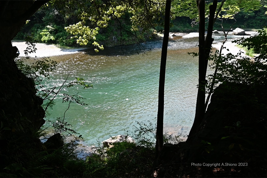 ハシゴ橋のに被さっている木と、渡り終え振り返って見た風景 ![]() 奥に流れていた川が、「櫛かんざし美術館」がある岸壁に当たりこちら側に流れが曲がり淵になっています。 楓橋・寒山寺に向かうエリア ▲top 祠の祀ってある大岩を過ぎると、上画像の大渕が崖下に見えてきます。この大渕は楓橋から直線上に来た流れが、吉野街道沿いにある「櫛かんざし美術館」が建っている基礎となっている山の様な大岩に当たり、行き場がなくなり北(左岸)に折れました。突き当たったところがまた大岩だったため、流れが川底を掘り大淵となりました。ここから下流は特に障害物が少ないので比較的真っ直ぐに下流の軍畑大橋まで流れていきます。 澤乃井園近くにある楓橋下流からの流れは、岩が点在する瀬に流れ下ります。 撮影:NIKON Z6II+Z14-30mmf4 VR S 1920x1080 60fps 640x360にリサイズ 移 動: 御岳渓谷遊歩道 東端入口から入渓 新緑の御岳遊歩道 景色が開ける大木がある中間地点 川上に架かるはしご階段のエリア 楓橋に向かうエリア リンク: 杣の小橋上流から 御岳橋方向へ 玉堂美術館へ 御岳小橋周辺 左岸から発電所方向へ 杣の小橋へ 1月の御岳渓谷遊歩道 御岳渓谷遊歩道~御岳山入口の路 御岳山周辺の見どころ 御岳小橋下流右岸の岩壁の遊歩道跡 御岳渓谷遊歩道右岸通行解除 新緑の御岳渓谷遊歩道杣の小橋~御岳小橋 多摩川上流部4つの水力発電所 2019年の台風15・19号で御岳小橋は流失しました。 渓谷の道:御岳周辺 1 2 3 4 5 6 次は・御岳橋へ |