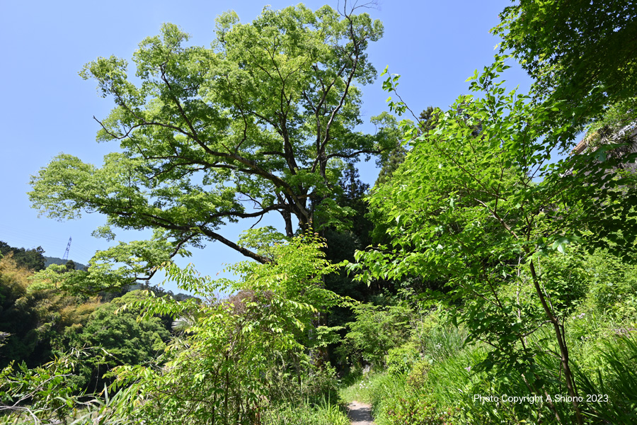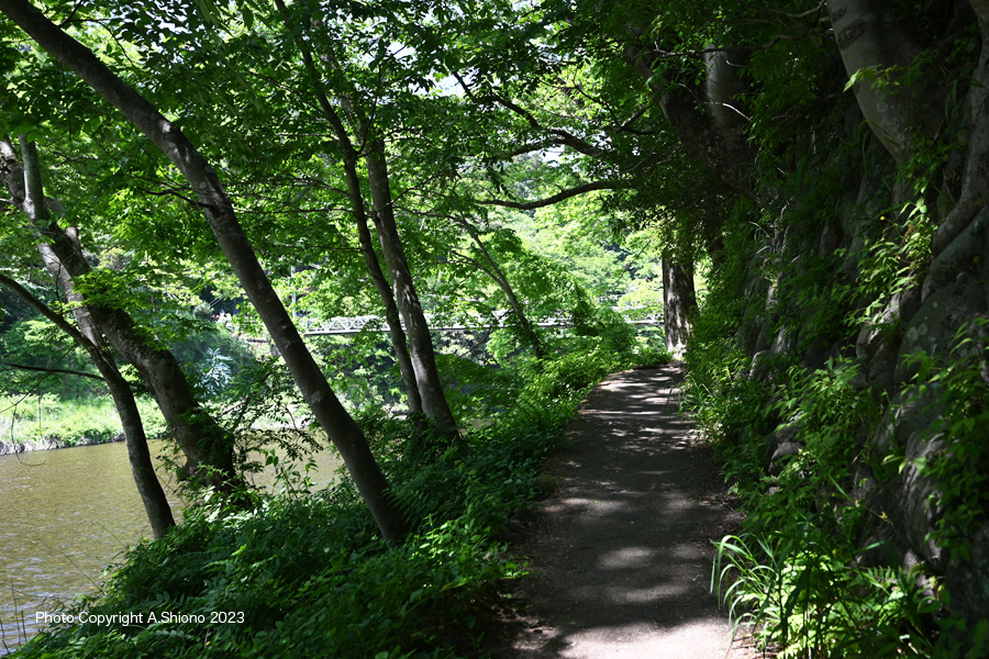 大きな岩が点在し出し、瀬が現れ音を立てて流れます。所々河原に向かうけもの道があるのですが、特に草の伸びが早い初夏からは殆ど覆いかぶさって隠れてしまっています。遊歩道すぐ脇にも所々に巨岩がありますが、上ったりするのは怪我の元になるので危険です。 今まで隠れていた多摩川と平行に走る青梅街道のガードレールが見え、車の走行音も聞こえて来ます。御岳渓谷遊歩道はこじんまりとした小さな森が3区域あります。しかし中間地点は、遊歩道沿いに覆いかぶさっていた木々がなくなり、草はらの様になります。このお陰で河原への見通しも良くなり景色が広がります。今まで隠れていた多摩川と平行に走る青梅街道のガードレールが見え、車の走行音も聞こえて来ます。 3番目の林間コース手前の岩が点在するエリア 撮影:NIKON Z6II+Z14-30mmf4 VR S 1920x1080 60fps 640x360にリサイズ ![]() 御岳渓谷遊歩道の中間地点にある大木で、ここから最後の林間コースとなります。 撮影:NIKON Z6II+Z14-30mmf/4 VR S FX_L 19.5mm ISO 100 1/640 f/4 -0段 大岩が点在する渓流を背景に、そよ風に揺れるもみじの若葉 撮影:NIKON Z6II+Z14-30mmf4 VR S 1920x1080 60fps 640x360にリサイズ 川上に架かるはしご階段のエリア ▲top