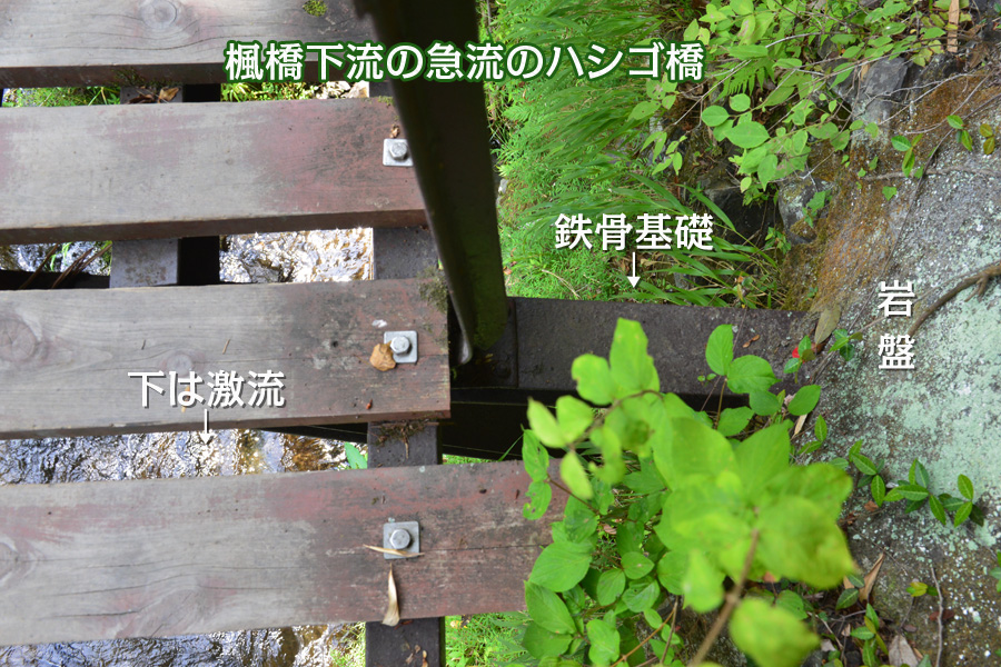 御岳渓谷遊歩道の東端の入口から川辺からかなり離れていた流れは、このエリアで最も左岸に近寄っています。遊歩道を沢井の楓橋あたりまで延長するために、岩盤にH型の鋼材を埋め込んでハシゴ階段が3箇所設置されています。こんな頑丈な鉄製のハシゴ橋も大水で歪み長期間この遊歩道は通行止めになっていました。 ![]() 2019年の台風19号で破壊され通行止めだった箇所は、修復され通行可能になっています。 ![]() このハシゴ橋の下が川の流れが強く岸壁に当たる場所
