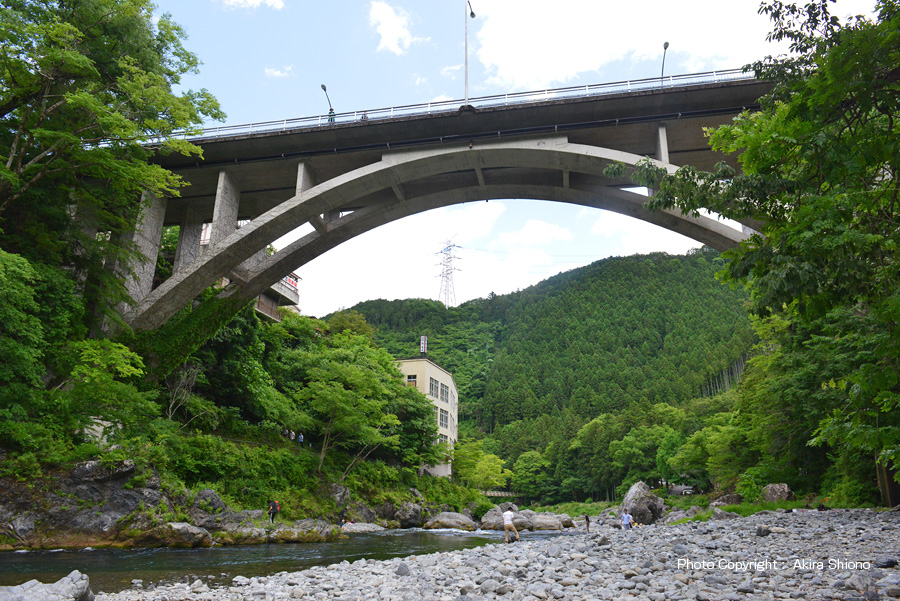 左ー開けた河原から見上げた御岳橋のRCアーチの橋脚。 右ー御岳橋の橋脚(右)と左はコンクリートの柱で水が滲み出しています。 ![]() 河原から見上げた御岳橋で、ここには駅前から御岳山へ向う西東京バスが通ります。左手はJR青梅線の御岳駅です。 一番上の写真は、上の木々の中の遊歩道から橋下の河原へ出た所の写真で、左手のコンクリートの建物は河鹿園(かじかえん:現在閉鎖中)で、遠くに御岳小橋が見えます。御岳渓谷遊歩道は、右の橋脚の木立の中に坂道があり、玉堂美術館・御岳小橋へと向います。 〔写真をクリックすると拡大されます 戻るボタンで前の画面に戻ります〕 玉堂美術館へ向う道 ▲top