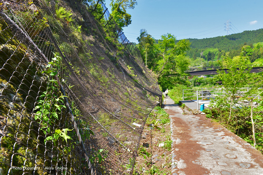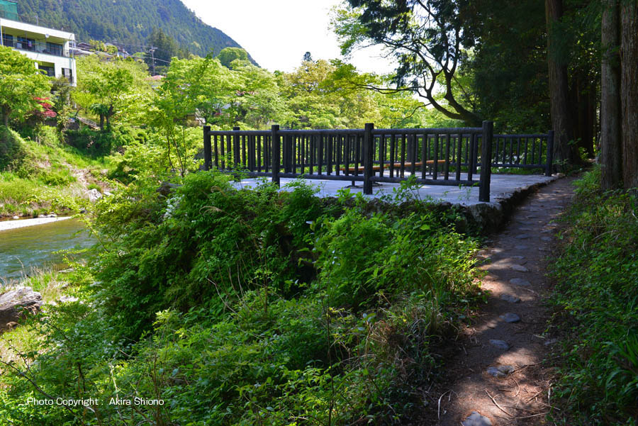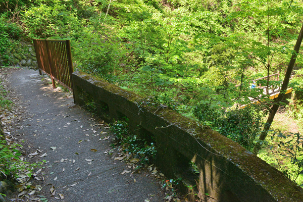 ![]() 下の写真は、寒山寺西側の暫く封鎖されていた、鵜の瀬橋方向へ続く『御岳渓谷遊歩道』の南側(右岸)の遊歩道。右下の下り坂の写真の遥か下の木々の間から、沢に架かる橋がに見えます。