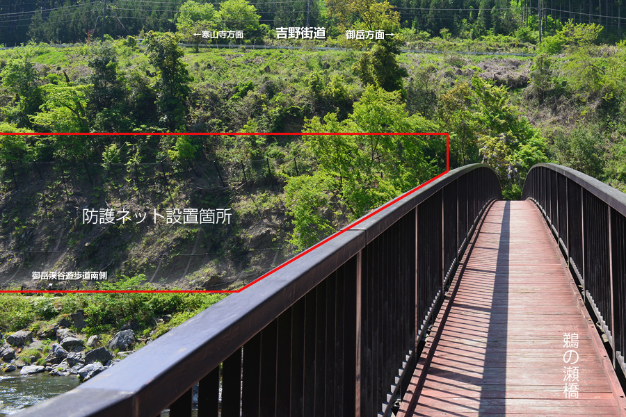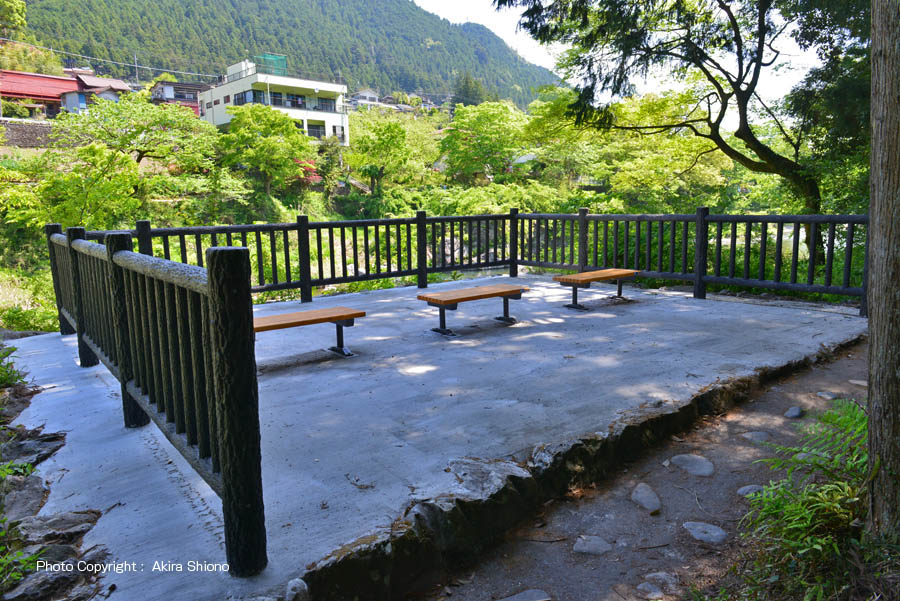 ![]() 開通した御岳渓谷遊歩道南は、橋南の裏面の工事と2の休憩エリアが設置されました。また、川沿いの道から寒山寺に向う坂道の石段も部分的に修理されたようで、安心して通行が出来るようになりました。鵜の瀬橋南側(右岸)から2つ目の休憩エリアで西側がパイプの柵だったのに対して、こちらはコンクリート製の模造木で柵が造られています。アクティブな激流の西側の休憩エリアに対して こちらは穏やかな流れを眺める事が出来ます。