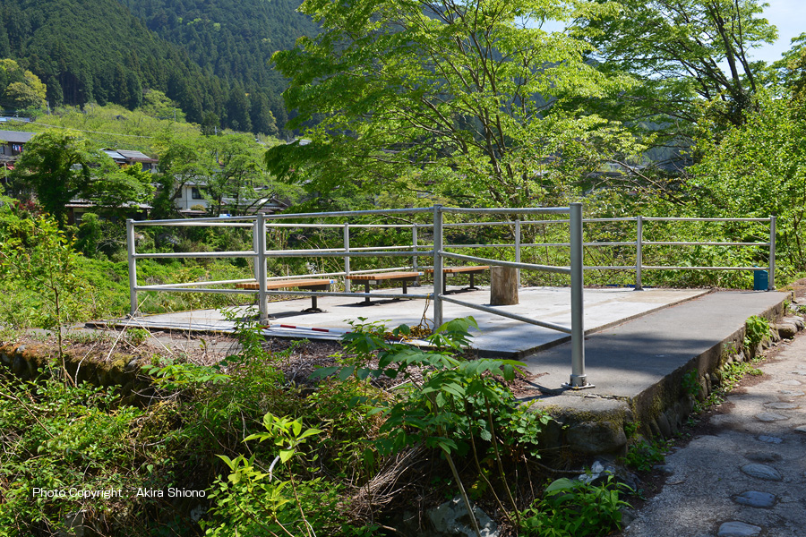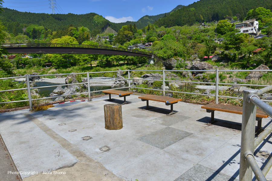 上の写真は、先ほど出て来た流された場所に造られた休憩エリアです。欄干は増水時にも水の抵抗が少ないステンレスパイプの様な物で造られています。 沢井〜鵜の瀬橋区間に2ヶ所の休憩所/東側 ▲top