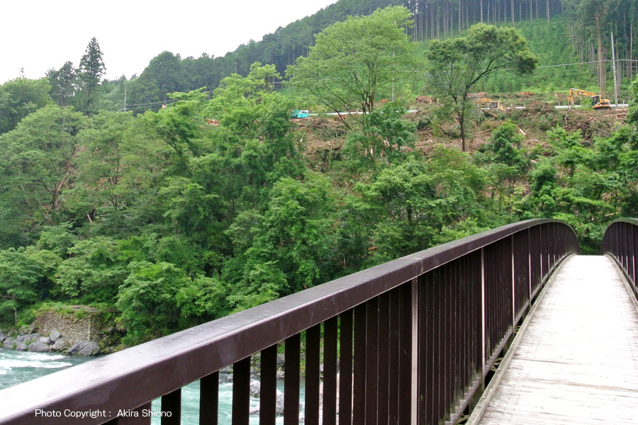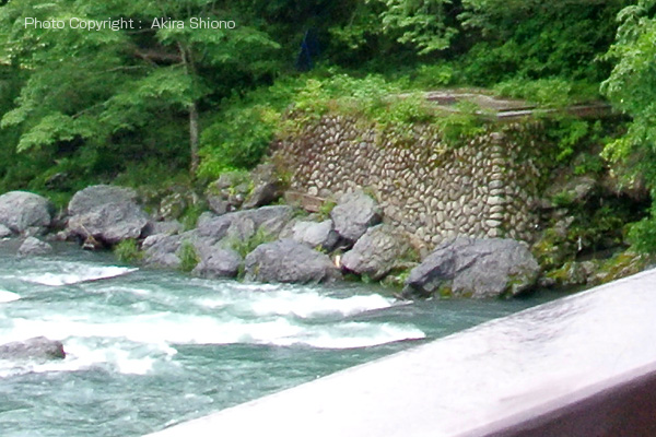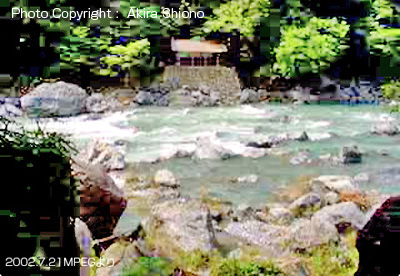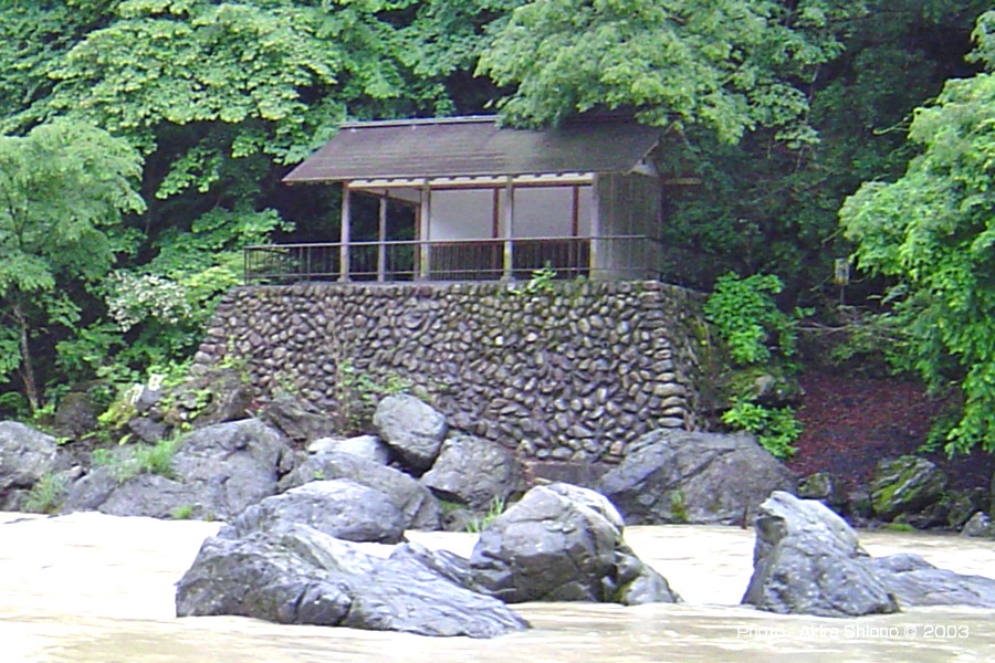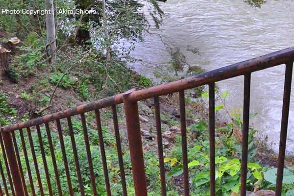 上の2枚の写真は、2012.6.24に鵜の瀬橋上から南側を見た写真です。この工事の前迄は、吉野街道の御岳トンネル辺りは鬱蒼としていて、昼間でも薄暗くなっていました。この写真には。吉野街道多摩川側の南斜面の木が伐採のための建設重機が2台見えます。 多摩川の増水 ▲top 御岳渓谷遊歩道の鵜の瀬橋近くには上流左岸と下流右岸に東屋があり、風光明媚な景色をゆったりと楽しむことができました。しかし、多摩川は上流の奥多摩湖(小河内ダム)周辺に大雨が降ると、昼飯の山々から大量の雨水が流れ込み、ダムを守るために放水するため年に数度大増水する事があります。 上の写真は、台風後の沢井にある楓橋から見た上流側の増水の写真で、いつもは透き通った多摩川の水もこの様に濁りの強い泥水になっています。右下の写真は、増水した鵜の瀬橋の下流の写真で、点在している大岩を増水した水がもんどりうって流れて行く様子が見えます。 沢井辺りの御岳渓谷遊歩道北側は、川より10m以上高い位置にあるので比較的安全ですが、増水で河原はほぼ濁流に飲み込まれてしまっています。 現存する左岸の東屋と以前あった下流右岸の東屋 ▲top 左上の写真は、鵜の瀬橋左岸上流に現在もある東屋です。右上の写真は、2002.7の鵜の瀬橋の当時の画質の悪いMPEG動画から切り取ったもので、この頃はまだこの辺りの景色を楽しむ東屋は健在でした。しかし残念ですが年代は分かりませんが、大型台風か爆弾低気圧が通過した時に、この石垣の上に造られた休憩所(東屋)は無惨にも跡形も無く破壊され流されてしまいました。 沢井〜鵜の瀬橋区間に2ヶ所の休憩所/西側 ▲top