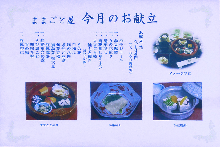 5月の御岳渓谷遊歩道の軍畑〜楓橋所 御岳発電所〜せせらぎの里美術館 新緑の鵜の瀬橋から御岳小橋 澤井から鵜の瀬橋 新緑と紅葉の澤井〜御岳発電所 1月の御岳発電所から御岳小橋 青梅 軍畑/楓橋下流の2月と野鳥 12月の澤井/楓橋周辺と野鳥〔写真をクリックすると拡大されます 戻るボタンで戻ります〕 豆腐懐石料理 まゝごとや トップへ 季節の献立 トップへ ![]() 豆腐懐石「まゝごと屋」の当時のメニュー