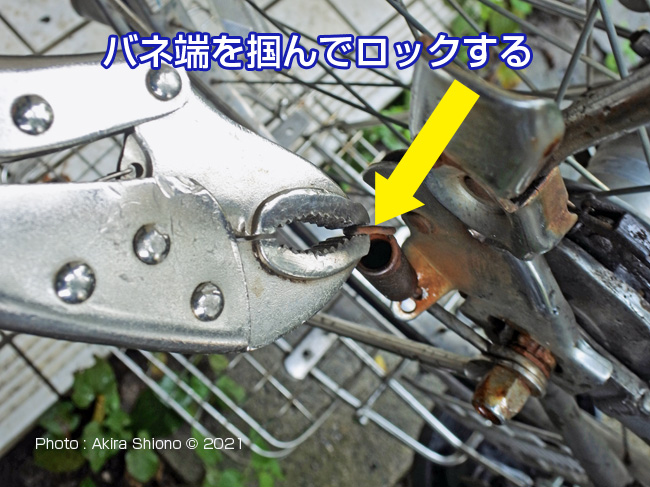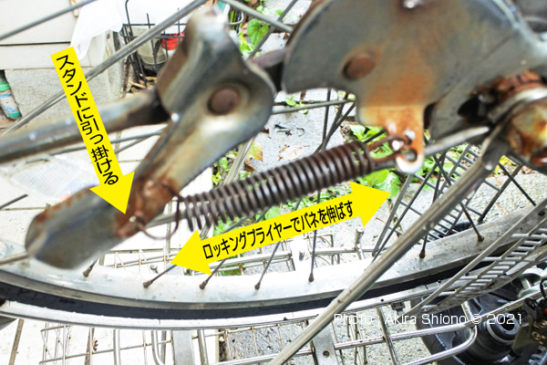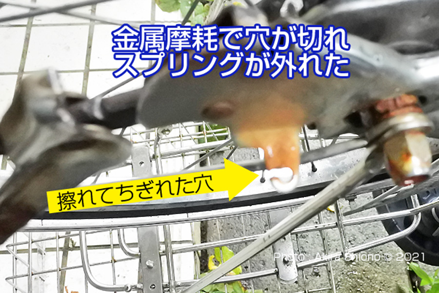 スタンド駐輪する時に必要不可欠です。もしスタンドが壊れて自立できない時を想像してみると、非常に不便なことになると想像できます。特にセンタースタンド付きの買物自転車は、重要な役目をしています。安定して自立させることが出来るので、重い荷物乗せや小さなお子さんを乗せたりするには必要不可欠です。 両足スタンドの構造 トップへ 左上の写真は両足スタンドを後から見たものでバネが2本使われています。両足スタンドには、此の様に左右にバネが付いています。このバネは、後ろから見て右側はスタンドを跳ね上げるためのバネです。左側のバネは重いスタンドを跳ね上げる役目に加え、スタンドを立てた時に自転車が動いて不用意にスタンドが外れないようにロックレバーを固定する役目もあります。 立たなくなったスタンドの原因 ▲top ママチャリのスタンドは、走行中に邪魔にならない様にバネによって上に引き上げられています。ママチャリも10年も乗っていると、自転車を駐輪。走行するときに毎回スタンドは酷使されています。この箇所はバネが使われているのでこのステーには相当の摩擦がかかっています。おまけに乗降時に擦られまくっているので以外に摩耗している場合があります。今回の症状は、スタンドが立たない状態でした。幸い右側のスプリングはスタンドを跳ね上げるだけのバネがあったので、常時跳ね上がった状態でしたので幸い走行はできました。 スタンドの応急修理 ▲top スタンドに新たな穴あけ ▲top