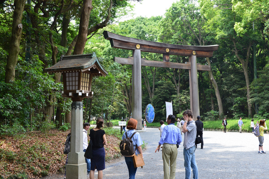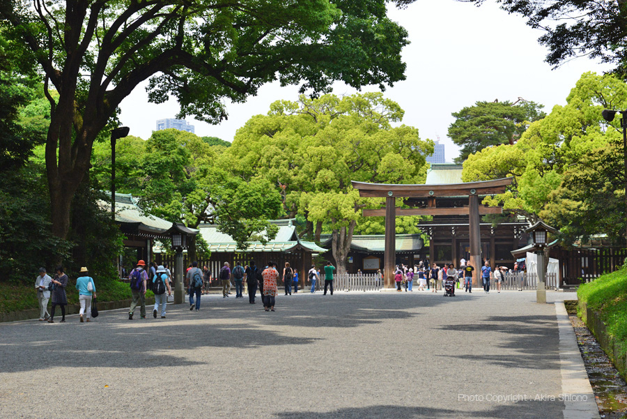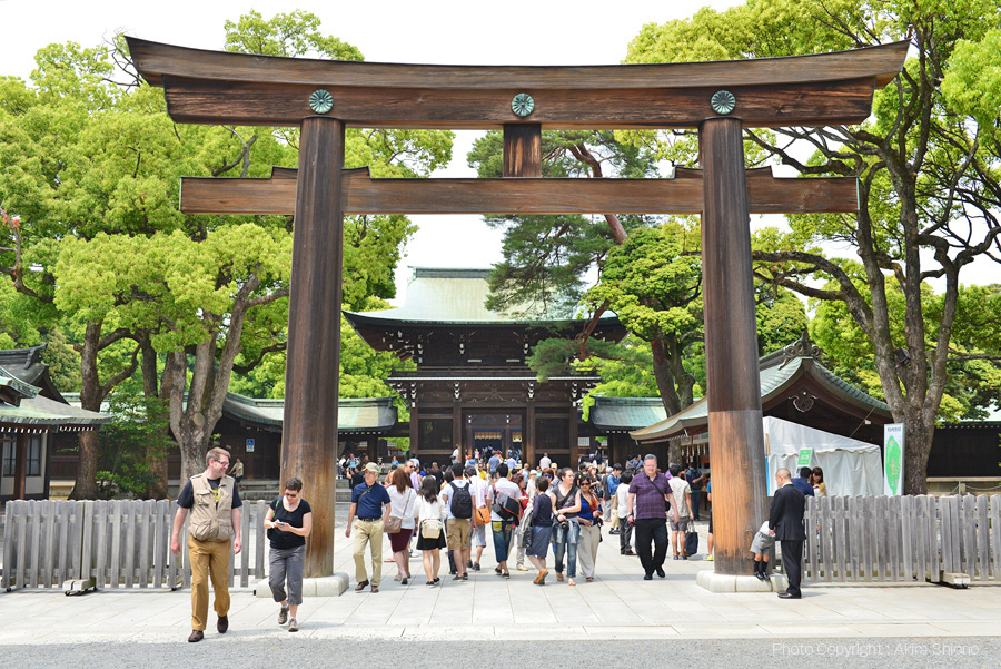 明治神宮は明治天皇と昭憲皇太后を御祭神とする神社で、初詣では毎年日本一の参拝者数を数えます。JRの最寄り駅では、北は代々木駅、南は原宿駅で、この西側にあり、代々木公園と接しています。明治神宮の広さは70万平方メートルで、域内は非常に大きな木々が広い参道の空の隙間が見えないくらい覆い茂っています。 北参道の鳥居 トップへ
