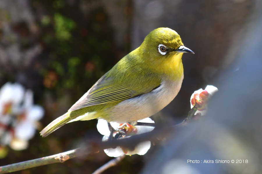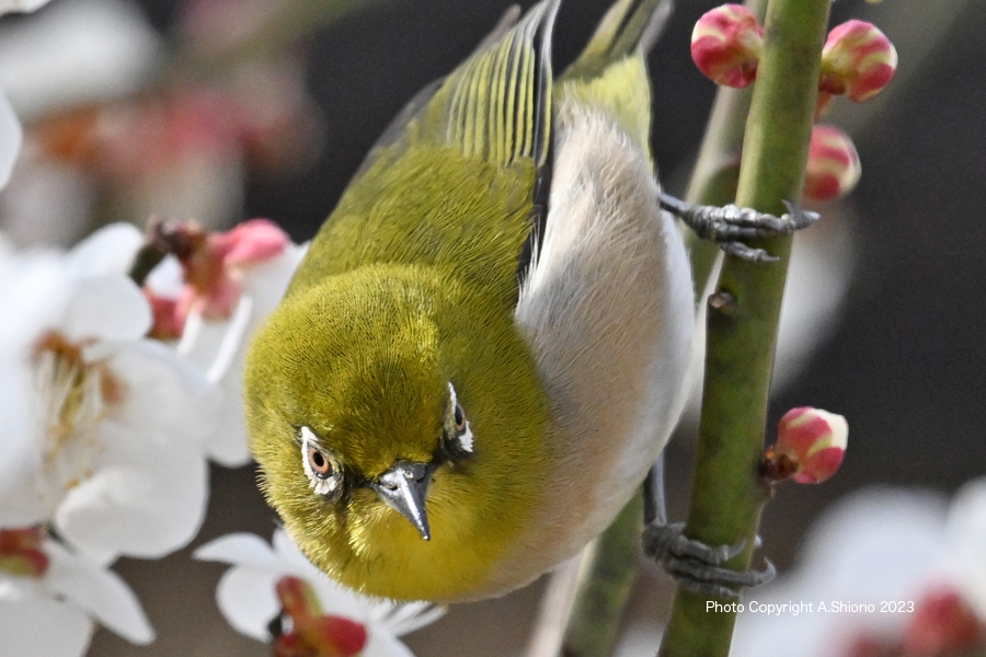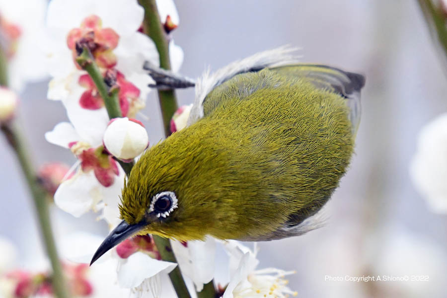 ![]() せわしなく餌を探し回ります。 撮影:Z6II+FTZ+TC-20EIII+VR200-500mmf/5.6E(1000mm相当) ISO2000 1/1600 f/11 -0.3段 4月下旬のメジロ トップへ 11月のメジロ トップへ 7月雑木林の中のメジロ トップへ 2月雑木林の中のメジロ トップへ 花の香りに誘われてやって来るメジロ トップへ メジロは日本列島に棲むスズメ目のメジロ科の野鳥です。住宅街の木々や、花が咲く木のある林などの花の蜜を求めてやって来る野鳥で、一年中に同じ地域で過ごす留鳥です上の写真は、庭の梅の木にやって来たメジロを撮影したものです。余談ですが、この梅の木には、やはり蜜を求めて、シジュウカラやヒヨドリも花の蜜を吸いにやって来ます。 メジロの顔 トップへ 梅の花咲く頃この木にやって来たメジロを真正面からみた写真です。上のメジロの写真と比べるとかなり栄養状態がいいのか丸くみえます。メジロの特徴は、この鳥の名前にある通り目の周りに白い輪があります。遠くから見た時ウグイス色なのでこの鳥と間違える方がいるようですが、目の周りの白い輪で判別ができます。ちなみに鶯は鳴き声が綺麗なので綺麗な色を想像する人もいる様ですが、色はこの色よりかなり地味な色です。 ![]() 花咲く梅の木の枝で良さそうな花を探しています。