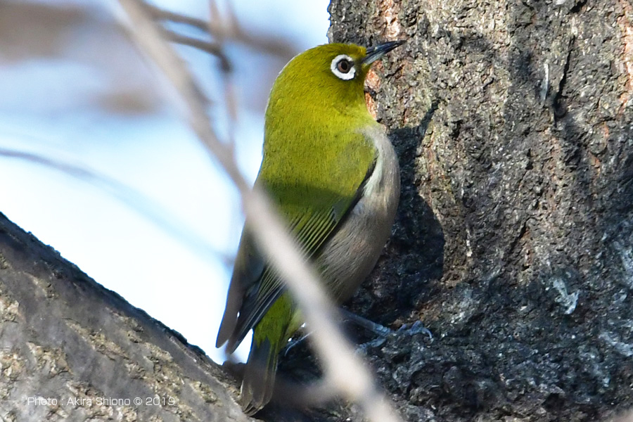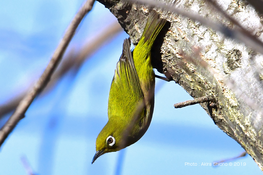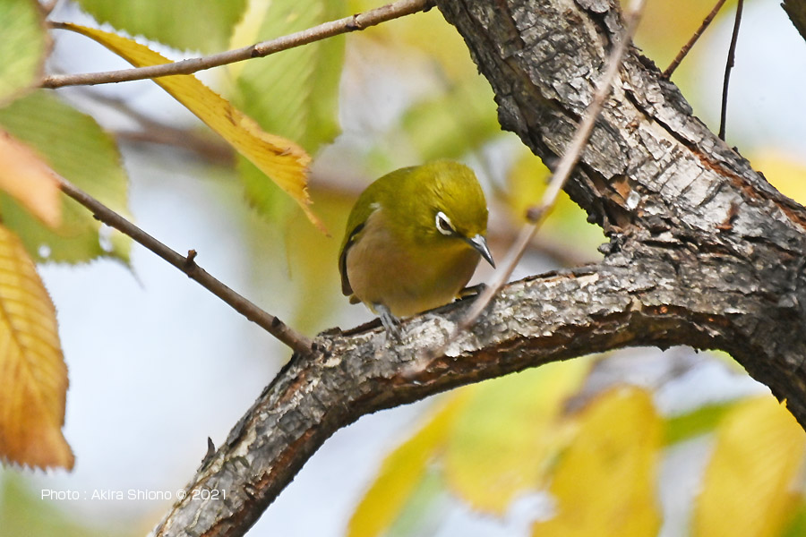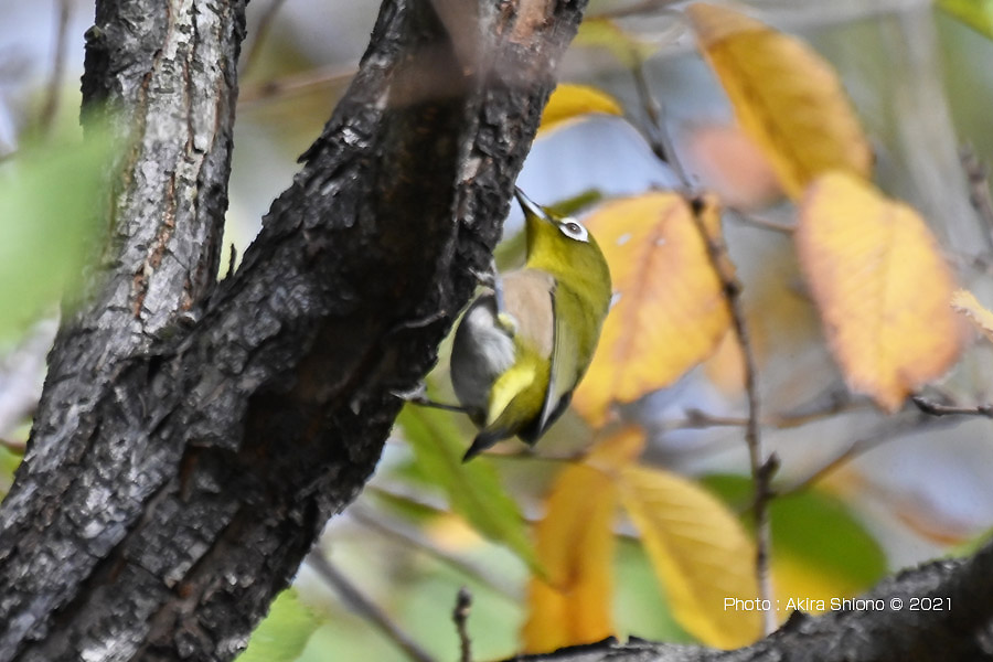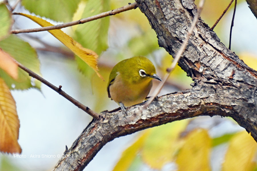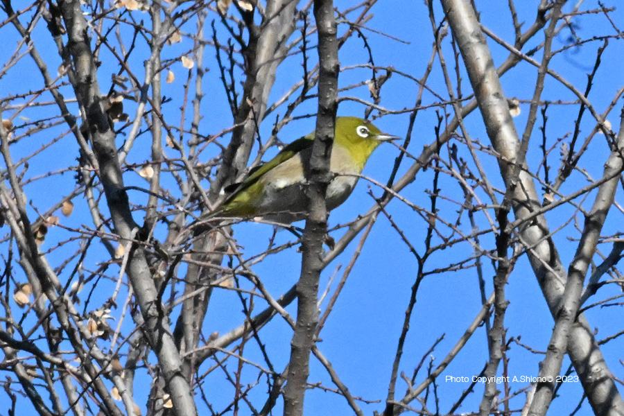 突然静かだった芝生の広場にあった木に沢山の小鳥が集まって来ました。これらの鳥は数秒で居場所を変えます。少し離れた場所から1000mmで覗いて見ると、最初に見つけたのはメジロで、他はシジュウカラ、コゲラを見つけました。 ![]() 忙しなく動くメジロを撮影しました。支えなしの手持ちなのでブレあり