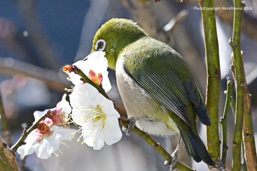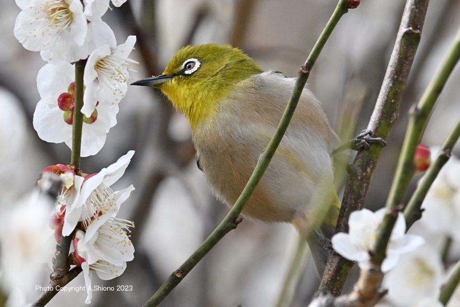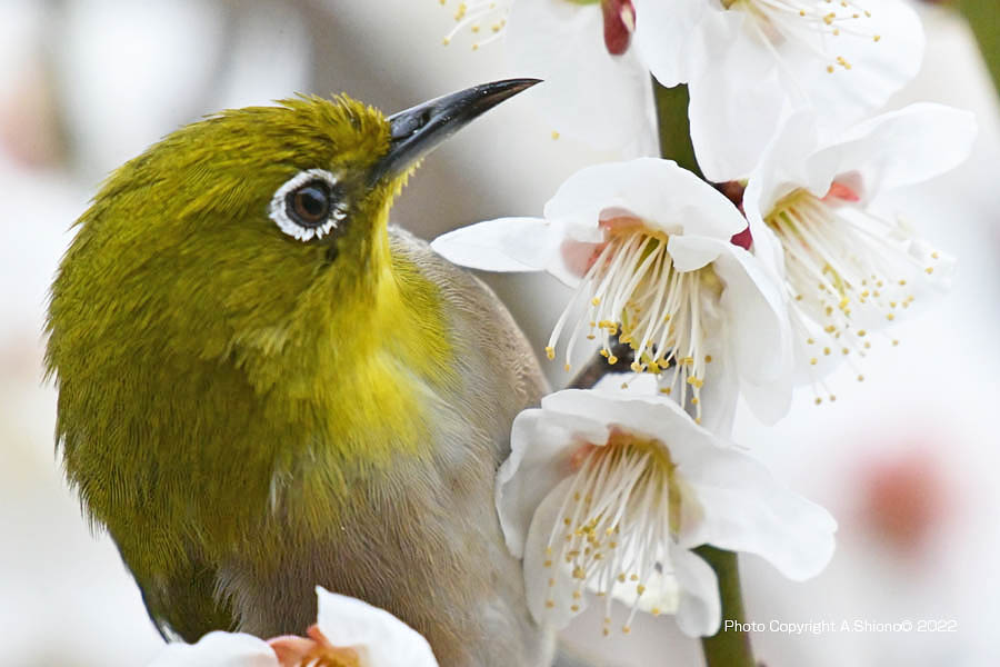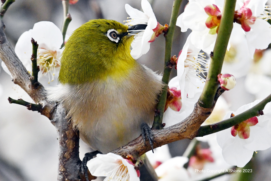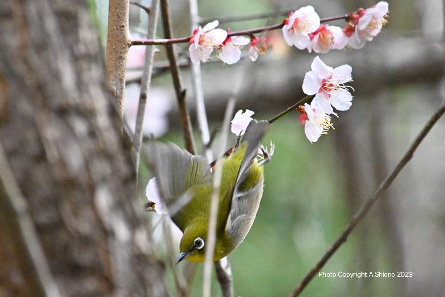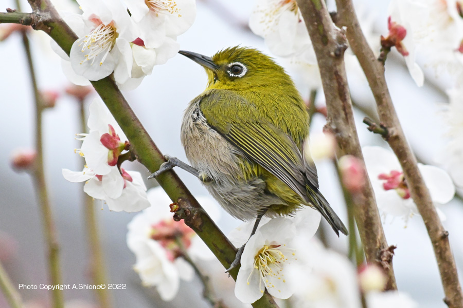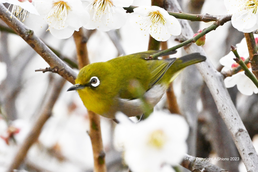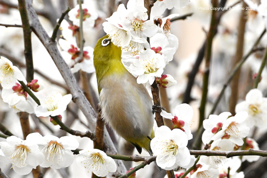 メジロ/雑木林・公園の野鳥 スズメ目メジロ科 移 動: 3月上旬のメジロ 11月上旬:遠くの木に留まるメジロ 4月下旬のメジロ 11月のメジロ 2月雑木林 花とメジロ メジロの顔 フィールドスコープ リンク: Z400mmf4.5Sで野鳥撮影 多摩川の野鳥たち/シラサギ トビが鮎捕獲 トビが野鳥捕獲 多摩川の野鳥たち/シラサギ 野鳥サイト(106種) 野鳥分類別サイト 野鳥サイトリスト版 梅の花の枝から飛び立ったメジロ NIKON Z9+NIKKOR Z 400mmf/4.5VR+Z TC-2.0 トップへ ![]() 梅の枝に止まり蜜を探すメジロ。 ※クリックでクローズアップできます 撮影:NIKON Z9+Z400mmf/4.5VR f/20 DX:Lサイズ600mm ISO 3200 1/640 f20 0段 2倍トリミング ![]() 梅の香りに誘われて梅の花咲く枝にやって来たメジロ。 ※クリックでクローズアップできます 撮影:NIKON Z9+Z400mmf/4.5VR f/20 DX:Lサイズ600mm ISO 2500 1/640 f20 0段 2倍トリミング 梅の花の枝から飛び立ったメジロ NIKON Z9+NIKKOR Z 400mmf/4.5VR+Z TC-2.0 トップへ ![]() 梅の花咲区小枝から飛び立つメジロ。 ※クリックでクローズアップできます 撮影:NIKON Z9+Z400mmf/4.5VR f/13 FX:Lサイズ800mm ISO 3200 1/400 f20 0段 3.5倍トリミング 梅の花の枝から飛び立ったメジロ NIKON Z9+NIKKOR Z 400mmf/4.5VR+Z TC-2.0 トップへ ![]() 梅の花咲く小枝から飛び立つメジロ。 ※クリックでクローズアップできます 撮影:NIKON Z9+Z400mmf/4.5VR f/13 FX:Lサイズ400mm ISO 5600 1/1250 f11 0段 2倍トリミング 梅の花の蜜をを吸いに来たメジロ NIKON Z9+NIKKOR Z 400mmf/4.5VR トップへ 下の画像は、被写体までの距離が近く、普段使っているTC-2.0を装着すると画像が大聞きなりすぎるので、NIKKOR Z 400mmf/4.5本体のみでの初撮影です。メジロは、梅の花の蜜を求め落ち着き無く動くために400mmの画角が丁度良かった様です。 ![]() 梅の花の香りに誘われて蜜を求めやって来たメジロ。 ※クリックでクローズアップできます 撮影:NIKON Z9+Z400mmf/4.5VR f/13 FX:Lサイズ400mm ISO 2000 1/4000 f9 0段 2.5倍トリミング