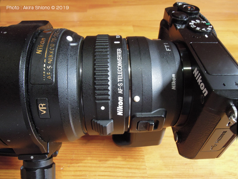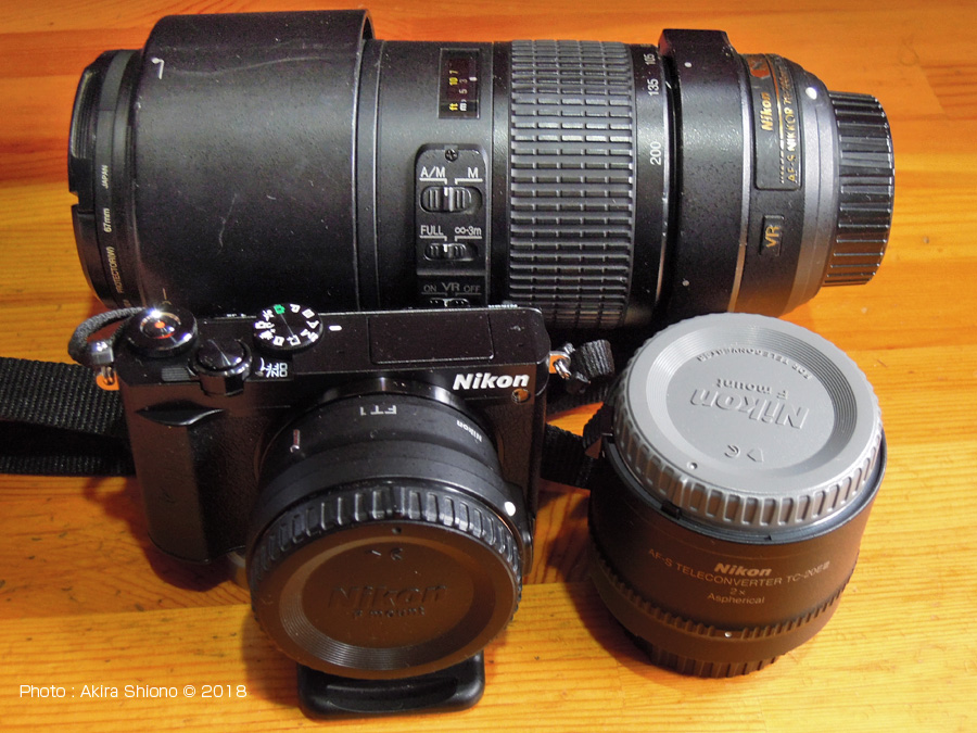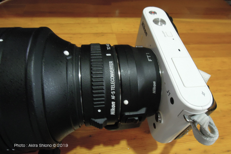 Nikon1用のレンズマウントアダプター「FT1」は、Nikon1のマウントににAF-Sレンズを接続する事ができます。倍率は、接続レンズの焦点距離が2.7倍になり、重量は150gとなっています。24-85mmの場合は、65mm~230mmになります。本体のレンズ10-30mmが35mm換算で27~81mmですから、この2本で27mm~230mmまでカバーできます。また、70-200mmを追加すれば200mmの場合は35mm換算で540mm、27mm~540mmまでカバーできる様になります。写真の様に2.0xのテレコンをつけた場合は、27mm~1080mmとなります。 FT1+TC-20EIII+70-200mmf4で最大378mm~1080mm トップへ ![]() Nikon1 J5とFT1とテレコンバーターTC-20EIIIとAF-S70−200mmf4 ![]() フードまでつけるとかなり長いです ![]() Nikon1 J5とFT1とテレコンバーターTC-20EIIIとAF-S70−200mmf4のカメラ周りのアップ