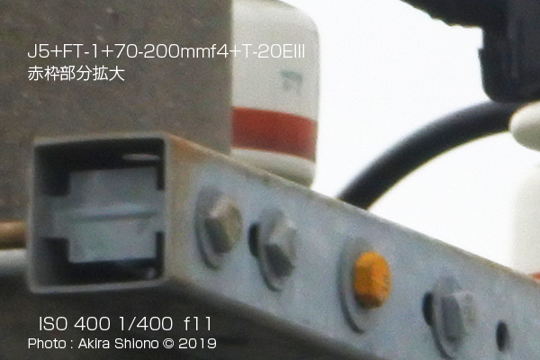 今回、ニコンのTC-14EIIIが加わりましたので、2.0xのテレコンTC-20EIIIと画像を比較して見ることにしました。200-500mmでテレコン撮影を行った時には、1.4xに軍配が上がりました。今回はAF-S 200-500mmE f5.6のテストを行った場所を撮影し、他の機種との画像と比較してみます。 上の段の2つの画像は、2.0xテレコンをJ5にFT1を接続して撮影したものです。下の画像は、1.4xのテレコンを同じように接続して撮影したものです。200-500mm f5.6で良好な画像を出した1.4xでしたが、この70-200mmGレンズでは、2.0xの撮影画像の方が解像感が良く逆転してしまっています。 付録:JJ1+FT1+TC-14EIII+200-500mm f5.6 ED トップへ