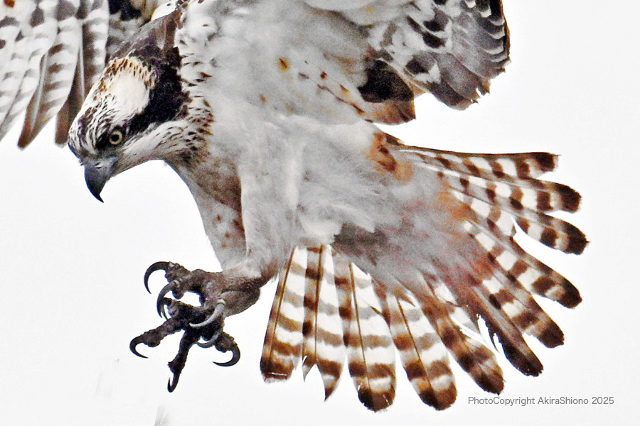 杭の上で魚をちぎって食べるミサゴ 右の足元には食べかけの魚肉がみえます 撮影:NIKON Z9+Z400mmf/4.5+TC2.0 DX1200mm ISO 900 1/1250 f/f11 露出補正 手持ち撮影 トリミング5倍 大きな魚を捕獲できる翼長の長い猛禽類:ミサゴ 2025.1.19 トップへ 「ミサゴがこのところ出没する」という情報をチャンスと捉え出かけることにしました。このところ情報を元に出かけても肩透かしが多く、2年前に上空を通り過ぎたのみでした。よく行く空が開けた広場の上空にはよく猛禽類の旋回をよく見かけるのですが、出そうな気配は全くありません。 魚食性の野鳥のクチバシと長い爪 トップへ ミサゴは空中から魚を狙い大きな爪で掴んで止まり木で鋭い嘴でちぎって食べます。その為に他のタカ類と同じで、嘴の先端は千切り易いよう鈎状に曲がっています。それに対して魚食性の仲間のサギ類やカワセミは嘴は細長いので、捕まえた魚の鱗に引っ掛からない様に向きを変え頭から丸呑みします。