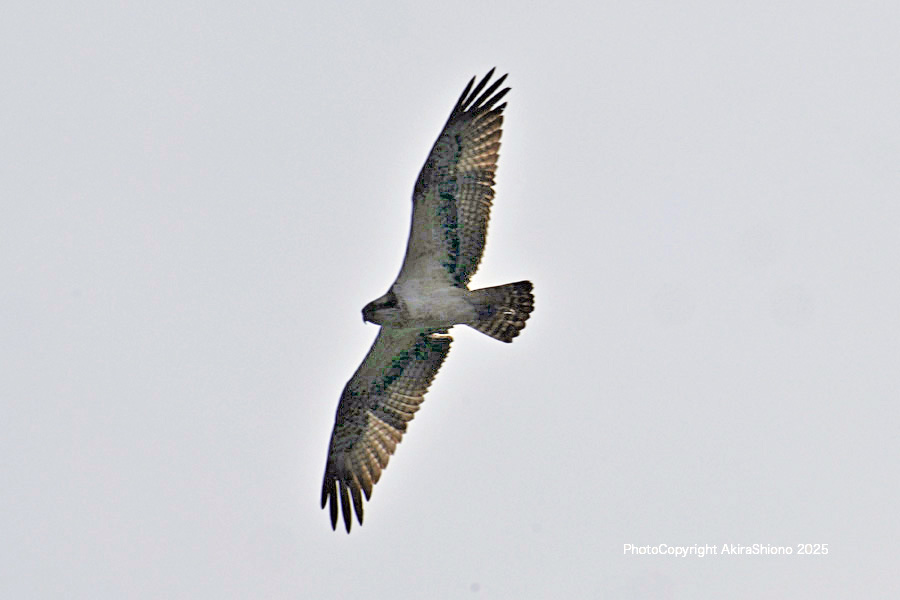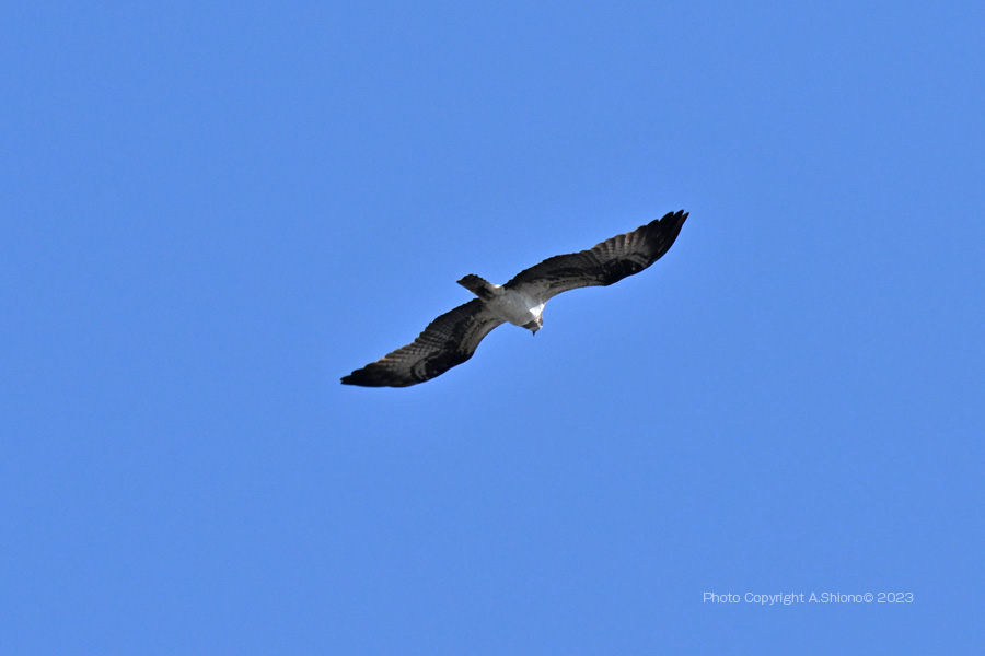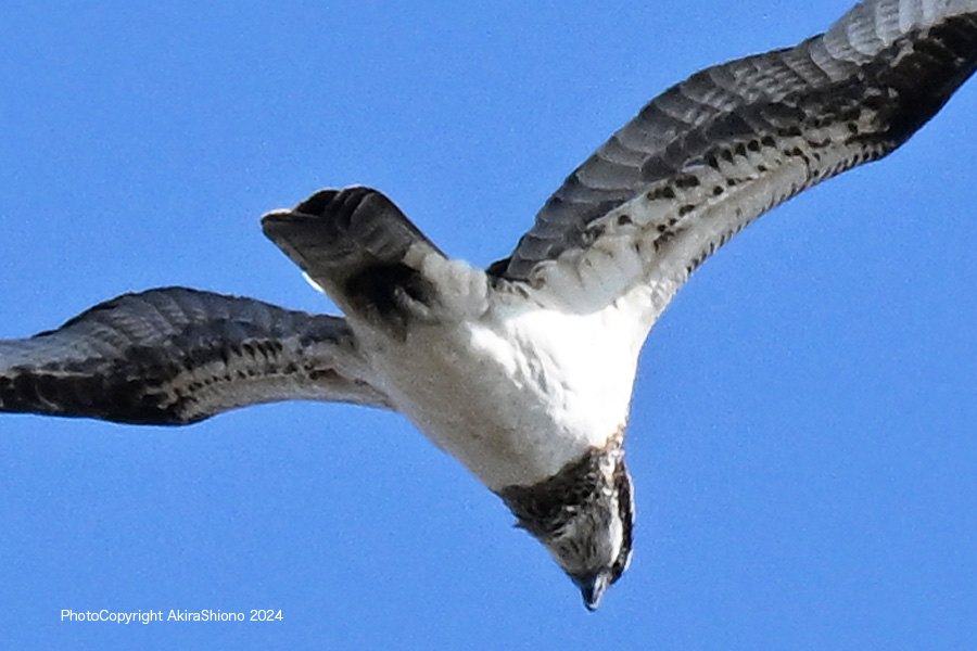 東京湾近くの湖沼の上を飛ぶミサゴ 撮影:NIKON Z9+FTZII+NIKKORAF-S200-500mmEf5.6+TC-14EIII 560mm FX:LサイズISO 640 1/800 f/14 0段 手持ち撮影 トリミング 空を飛ぶミサゴの姿 ![]() 翼を広げて羽ばたくミサゴスピードが乗っているので羽ばたきは少なめです。 撮影:NIKON Z9+FTZII+NIKKORAF-S200-500mmEf5.6+TC-14EIII 560mm FX:LサイズISO 640 1/800 f/14 0段 手持ち撮影 7倍トリミング ![]() 翼が下がった状態のミサゴの羽ばたき。 撮影:NIKON Z9+FTZII+NIKKORAF-S200-500mmEf5.6+TC-14EIII 560mm FX:LサイズISO 640 1/800 f/14 0段 手持ち撮影 7倍トリミング ![]() この後、東方向の狩場へ飛び去りました。 撮影:NIKON Z9+FTZII+NIKKORAF-S200-500mmEf5.6+TC-14EIII 560mm FX:LサイズISO 640 1/800 f/14 0段 手持ち撮影 7倍トリミング 移 動: 魚食の猛禽類:ミサゴ 1月上旬海辺近くの池の空を飛ぶミサゴ