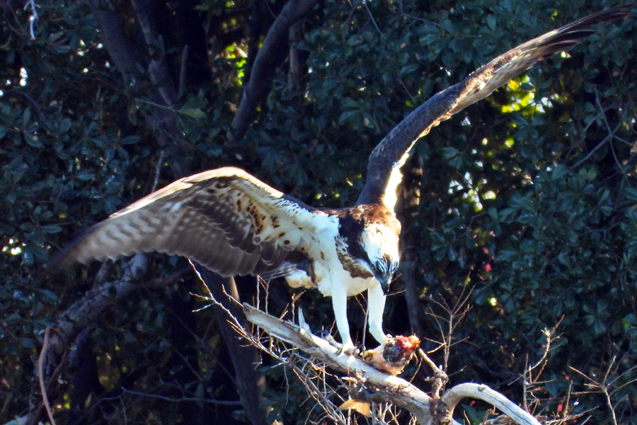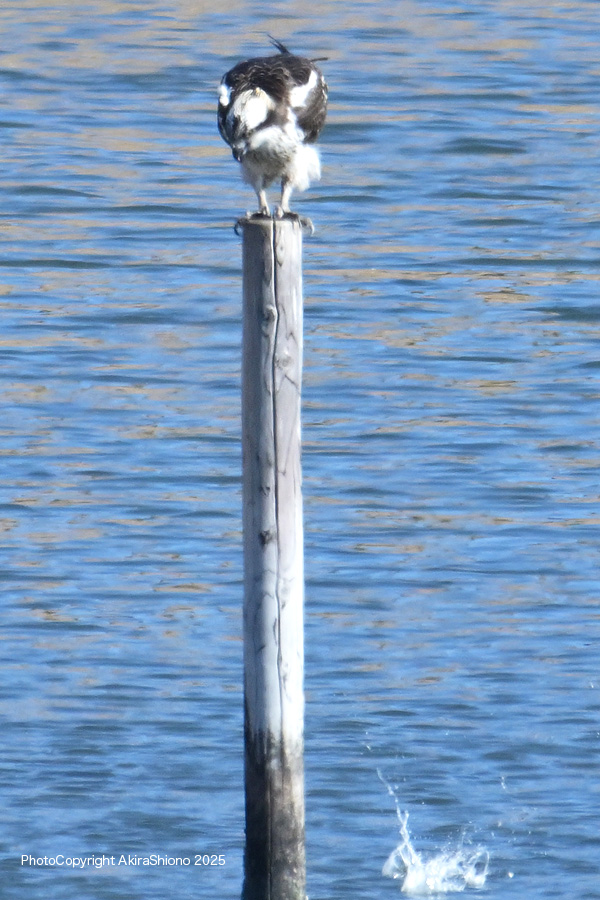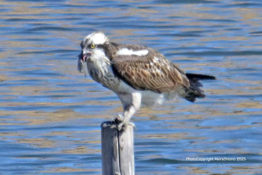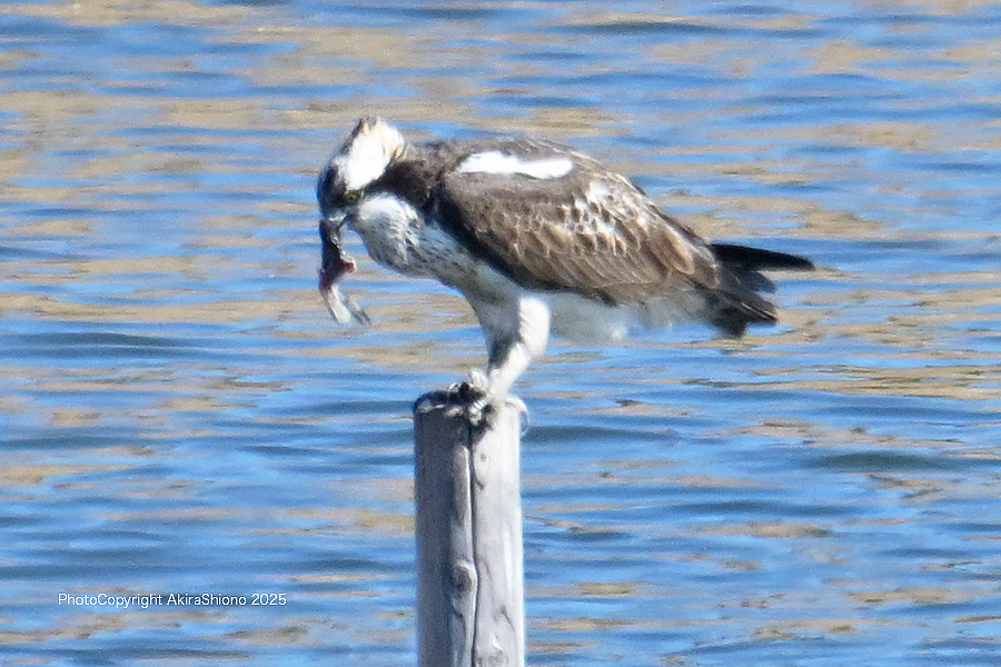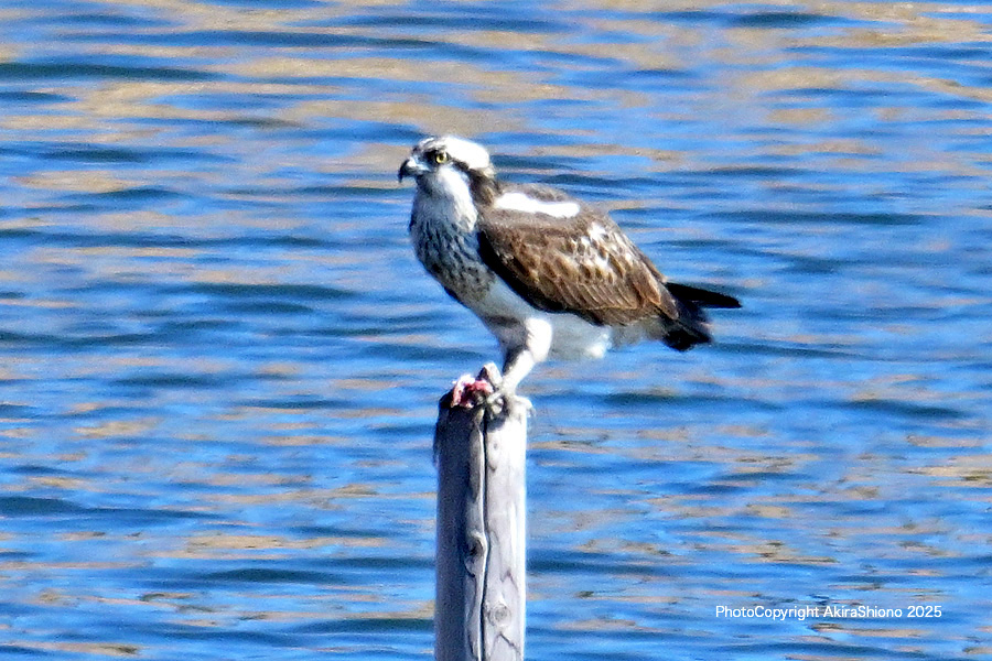 よく見るとミサゴで、ミサゴが止まっているのは150m程先の杭です。しばらく観察していると、長い爪の留まっている杭の辺りから魚らしきものをちぎって食べていました。