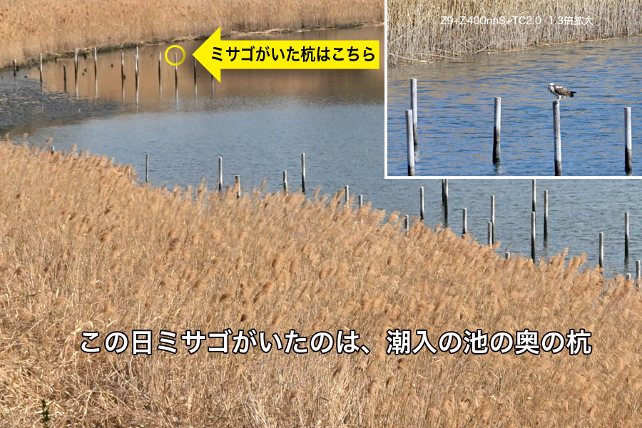 杭の上で魚をちぎって食べるミサゴ 撮影:NIKON Z9+Z400mmf/4.5+TC2.0 DX1200mm ISO 900 1/1250 f/f11 露出補正 手持ち撮影 トリミング5倍 超望遠レンズのカメラマンが数人集まっているので、その先には何がいるのか?と興味をもって探して見ました。この場所には手前側と、かなり離れた奥の2箇所に杭が並んでいます。肉眼では判断できなかったので、1200mmで覗くと杭の天辺に大きめの鳥が留まっていました。