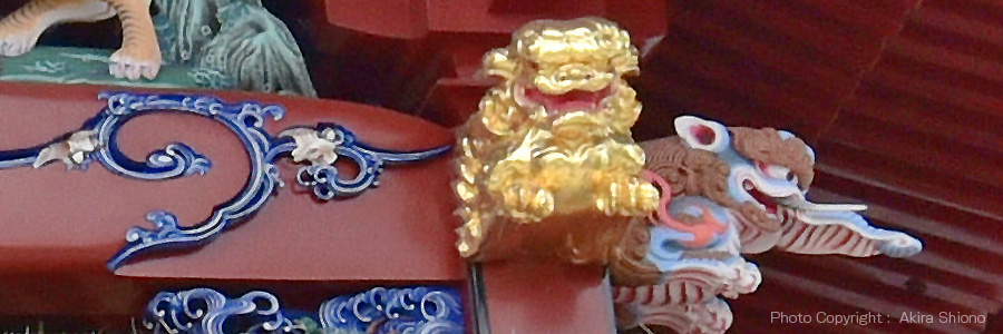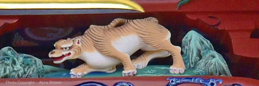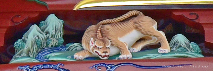 上から2段目には左右に厄よけ、魔除け、守り神である虎の彫り物があります。 左手は威嚇のポーズ、右は獲物を狙うポースのようです。