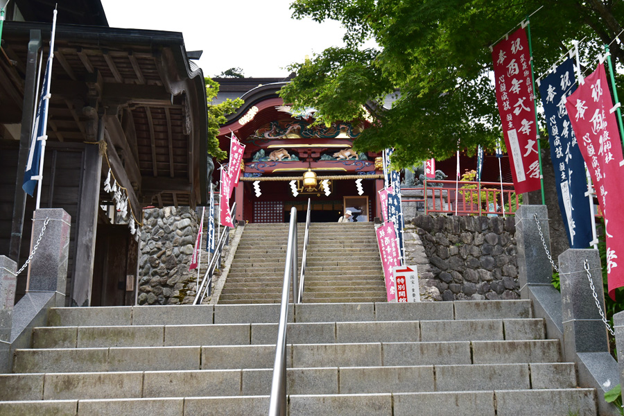 行きはお参りをしていなかったので、ここで神社にお参りをします。山腹の傾斜に沿って作られた石段は、段数は330段で傾斜もあるので大雑把に計算しても60mくらいの高度差があります。踊り場が所々にあり、場所によってベンチが設置されています。ご年配や体力にあまり自信が無い方は安心です。