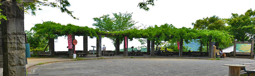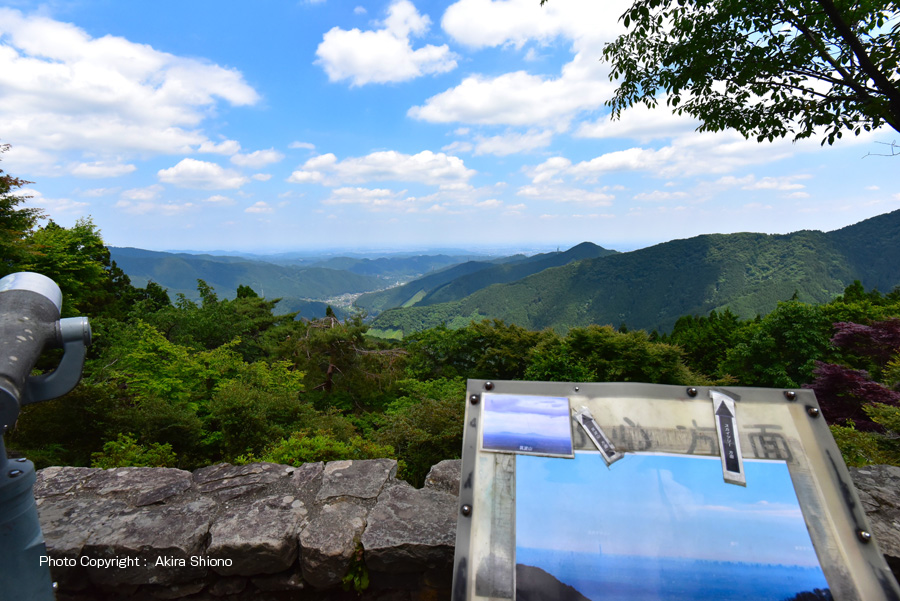 御岳平展望台は、御岳登山鉄道(ケーブルカー)の御岳平駅からすぐ近くにある円形広場の谷側に広がる展望台です。こちらには観光地用の大きな双眼鏡が三基備え付けられています。中央の据付けの双眼鏡のそばには、写真がプレートに挟まれていて、東京スカイツリー方面の写真に矢印が貼付けられています。ボードについている右側の大きめの矢印には「スカイツリー方面」、左の小さい矢印には「筑波方面」とあります。この大きな写真の右端には「東京タワー」もあったので、空気がきれいな日にはよく見える事でしょう。