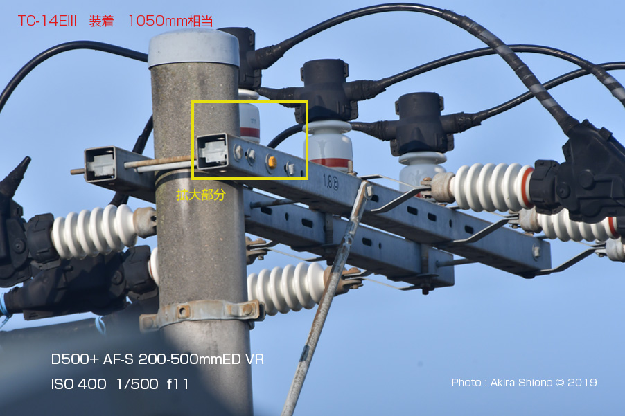 ![]() 上の2.0xテレコン使用時(1500mm相当)テレコンのアップ画像の黄枠のアップ画像と1.4xとテレコン使用時(1050mm相当)の画像(右)