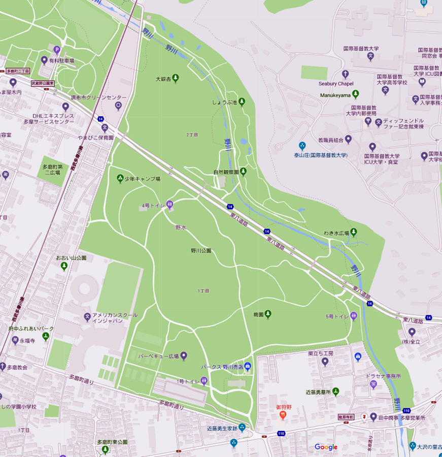 移 動: 東八道路が貫く野川公園 川と崖線と芝生の緑 リンク: 新緑の自然観察園/5月 野川公園/4月の新緑 新緑の自然観察園/野川公園 自然観察園の8月/野川公園 6月の神代水生植物園 東八道路が貫く野川公園 トップへ 国道246号線(東八道路)の国際基督教大学の南西にある、調布市野水一・二丁目、小金井市東町一丁目、三鷹市大沢二・三・六丁目にまたがる所に野川公園があります。約40万平方メートルと広大な公園には、炊事設備がありデイキャンプができる『少年デイキャンプ場』、公園の南側の駐車場そばにある『バベキュー広場』が天気のいい日には行楽の方々で賑わっています。またスポーツ施設はゲートボール場、テニスコートがあり、東八道路の北側には、『自然観察センター』や無料で入場できる『自然観察園』、野川が流れているなど緑と水がある公園で多くの方々に親しまれています。この公園には、アスレチックや児童遊具があり売店なども完備されていますので、子連れの親御さんにも人気です。 川と崖線と芝生の緑 トップへ