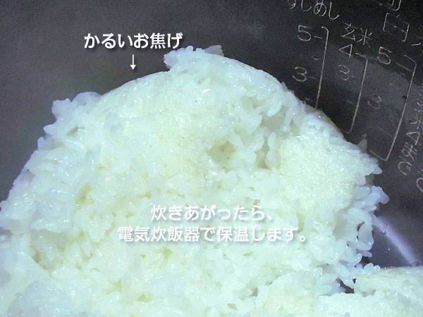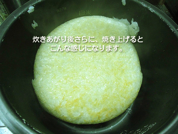・炊飯モードまかせにして、暫くすると沸騰して大きな泡が見えてきます。 ・だんだん泡が消えて暫くすると、アラームが鳴ります。 ・そのうちに自動消火します。 ・お焦げが好きな方は、さらにスイッチを入れて火をつけます。 ・そのうちに小さくパチパチと聞こえてきます。 ・お焦げの度合いは、香りで判断します。 お焦げに関しては、コンロが賢いのでコーティングなしのライスクッカーの様に 焦がす事が難しくなりました。さらに炊き上げると右の写真のようになります。お焦げの香りは、ライスクッカーに軍配が上がります。 TOPへ リンナイ専用炊飯釜の感想 トップへ