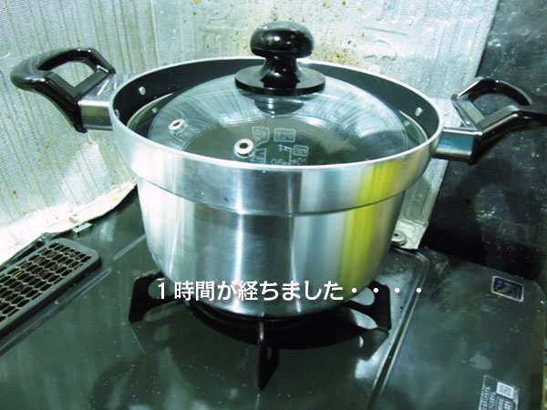 アウトドアのライスクッカーでガス炊飯をした時は、お焦げの香りが良いご飯ができます。しかしクッカーは加工が施されていない物でしたので、ご飯を保温釜に移す際に頑固にこびり付きしました。しかし加工がされていない方が、香ばしい香りのした『本格的なお焦げ』が出来ました。その代わりに、焦げ付きがひどくなる前に火力の調整が必要です。目を離したりしてして、焦げた香りがした時は手遅れの感があり、後々の鍋の焦げ落としが大変になります。このように始終炊き具合の状態の監視が必要となり非常に面倒です。 麺茹でに最適な形状 トップへ 左の写真は、麺ゆでをした時の写真です。寸胴鍋の様な形の鍋は沸騰したと同時に一気に吹き上がって、こぼれる場合が多くあります。 この種の鍋は上部が一段大きくなっていますので、この部分で面積が広がり吹きこぼれを緩和してくれます。この釜は文化鍋系の形ですので、炊飯の他に吹きこぼれやすい麺・パスタの茹でに効果を発揮してくれます。この鍋の使用で吹きこぼした時の、コンロのトップの掃除も激減します。(火力は中火以下で調整が必要)