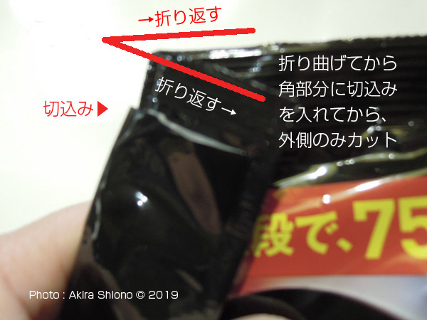![]() パッケージ上部の畳んである部分を開き、折り返します。 折り返した部分の頂点を外のみカットします。