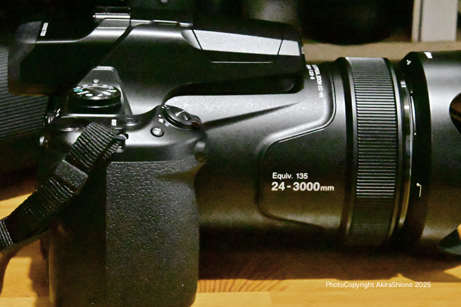 付属品で気になったことは、ショルダーストラップの品質で、滑り止めが一部しか無いひと時代前のD80やD7000の頃のストラップを思い出します。この素材は使っていく内に毛羽立ちが起こります。現在は厚みが薄く裏全面に滑り止めがついている柔らかい素材(D800用)の物に交換してあります。これは直接触れる物なので上質の物にして欲しいものです。 Zシリーズに加わったP1100、操作について気になった箇所 2025.3.1〜 トップへ