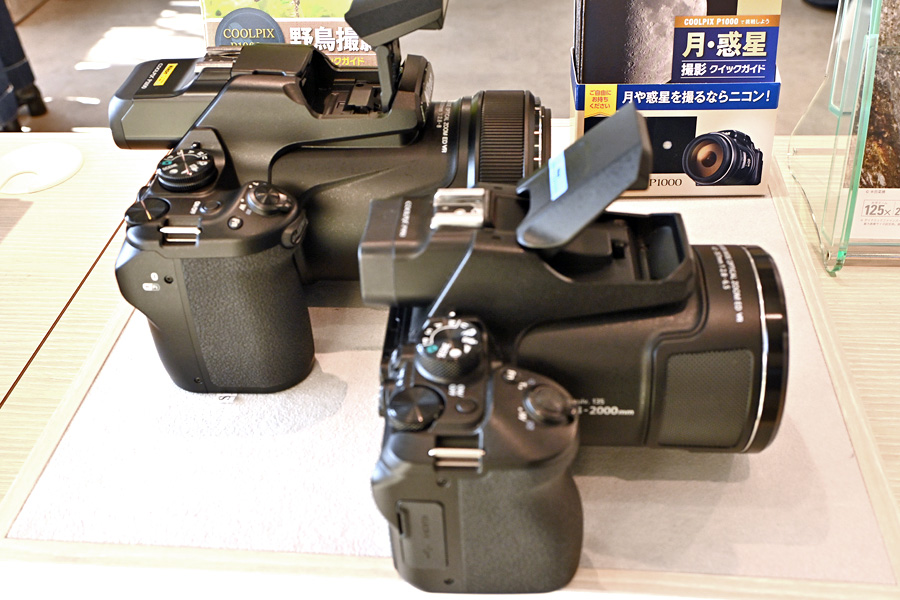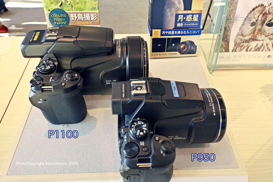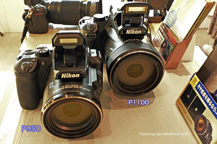 野鳥撮影現場で、このP950やP1000をよく見かけるので人気のカメラの様です。気になったのでネットで探してみるとP1000は販売中止となっていました。価格.comのページには新品で28.9万円、中古で15.5万円という価格で売られていました。 以外に重いP1100 トップへ 高倍率ズームのCOOLPIXはP950と並んで展示してあったのですが、最初は知らずにP950をいじっていて、P1100は以外に軽いなぁ思ってポップアップフラッシュをあげると・・・これは違う!と気がつきP1100の方を触ってみました。P950は2000mmまでのズームで1Kg強、、P1100は3000mmのズームレンズなので1.4kg位と重量差があります。実際持って見るとかなり重量差を感じました。おまけにP1100は焦点距離が1000mm長いので鏡胴が太く、手の小さな方だと持ちにくく感じました。焦点距離が3000mmまでいらない方や、女性の方はこちらの方が撮影も楽だと感じました。 P950とP1100の実物比較 トップへ