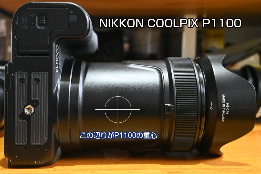 テーブルなどに置いたP1100を取り上げる時に鏡胴が太いので、掴みづらく取り上げにくくなっています。そして大きなレンズのせいで重心が前にあるので、グリップで掴んだ時も重いので手を添えて両手で持ち上げる事になります。