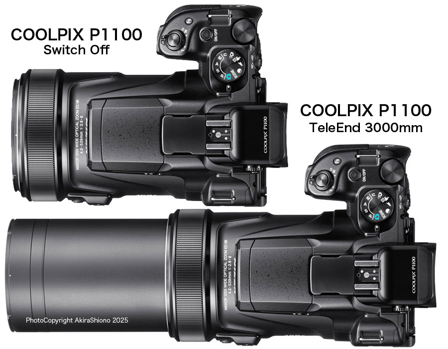 ![]() P1100のテレ端とワイド端の状態と背面